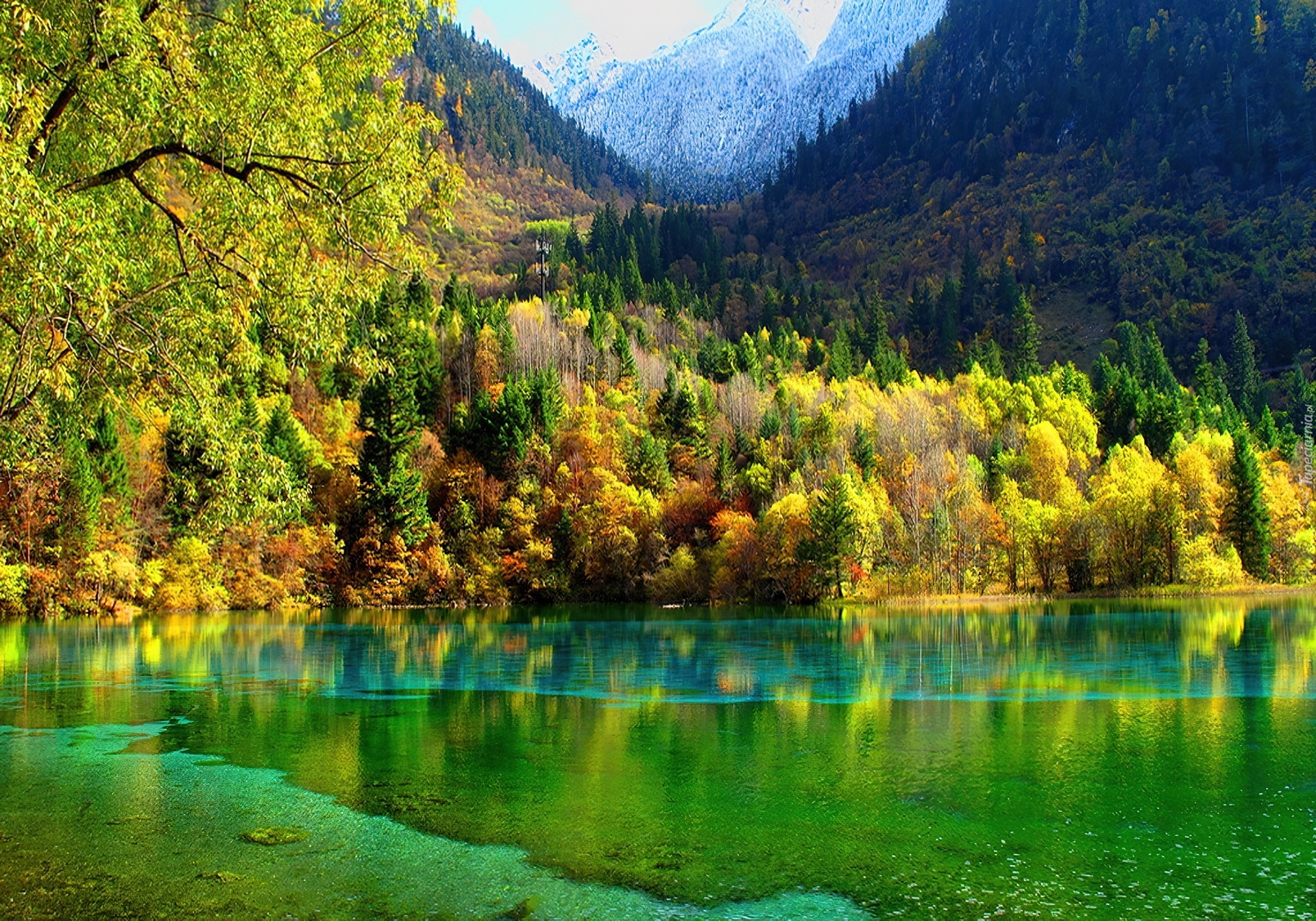 Edytor tapety: Góry, Drzewa, Jezioro