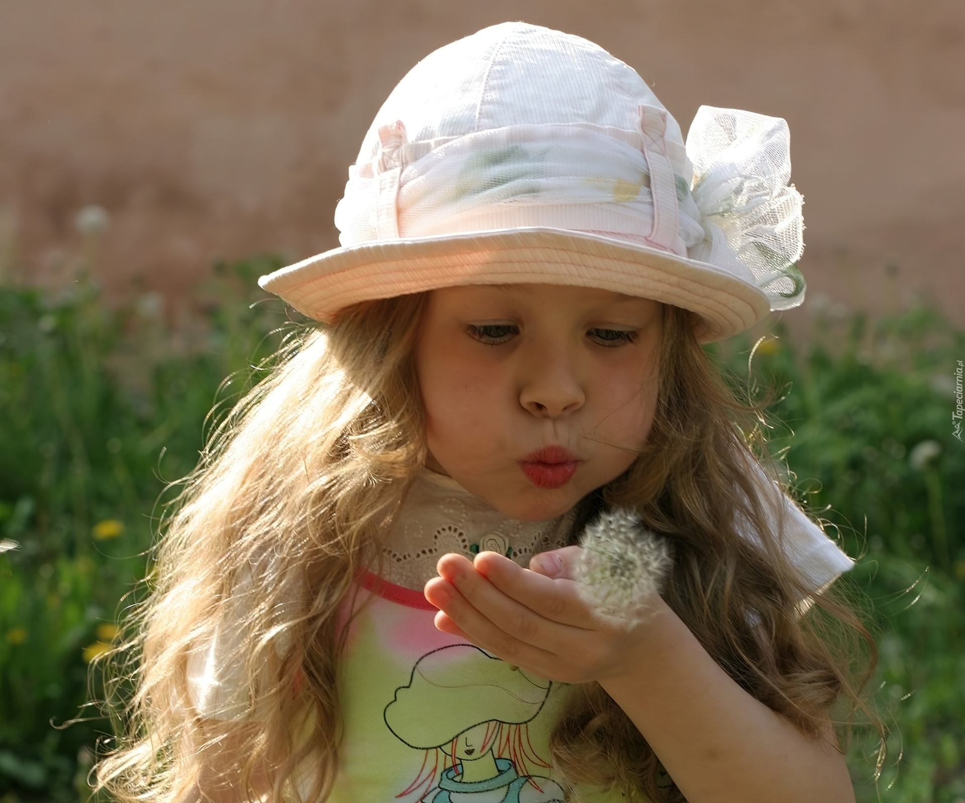 Edytor tapety: Dziewczynka, Łąka, Dmuchawiec, Zabawa, Kapelusik