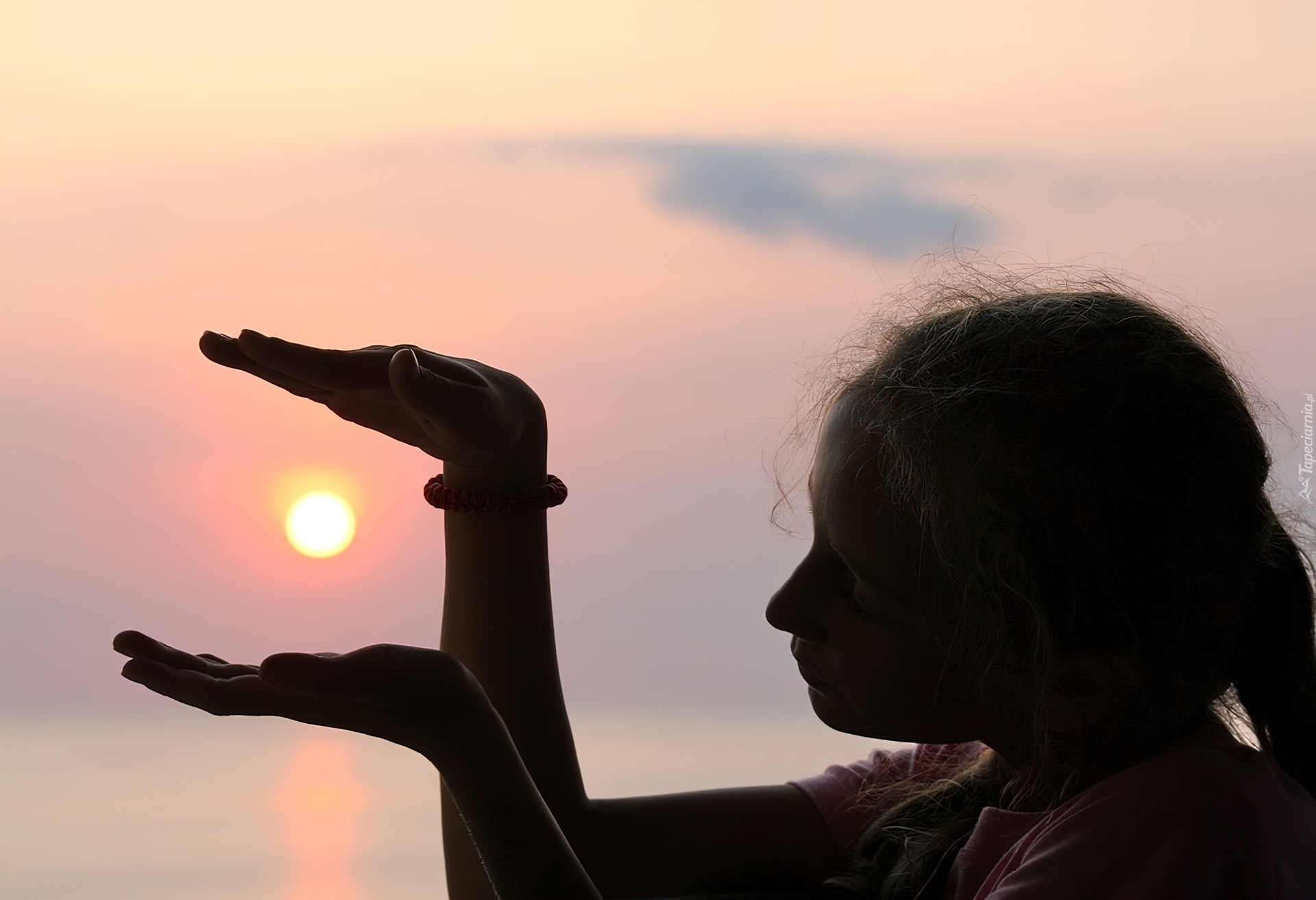 Edytor tapety: Zachód Słońca, Dziewczynka, Dłonie