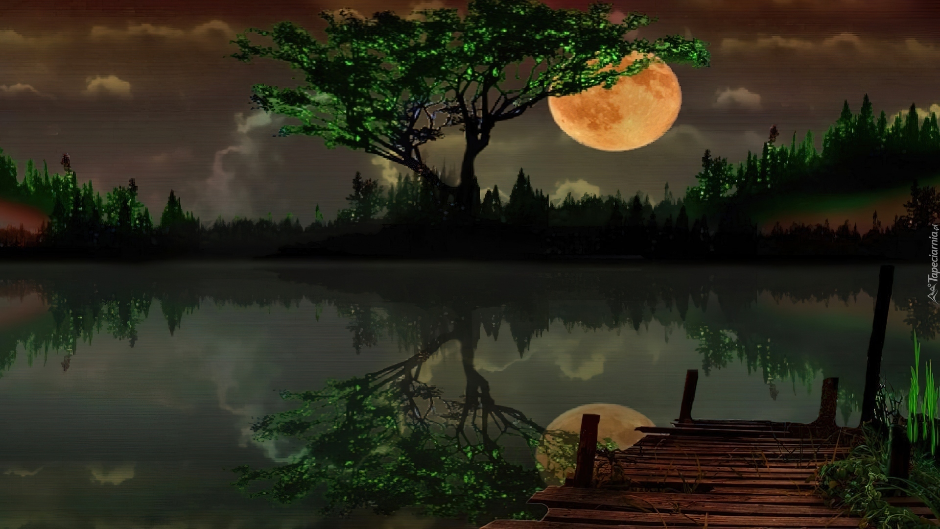 Edytor tapety: Jezioro, Odbicie, Lustrzane, Pomost, Księżyc