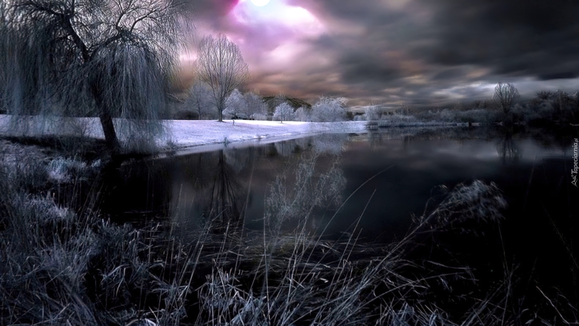 Edytor tapety: Jezioro, Pochmurne, Niebo, Zima, Drzewa