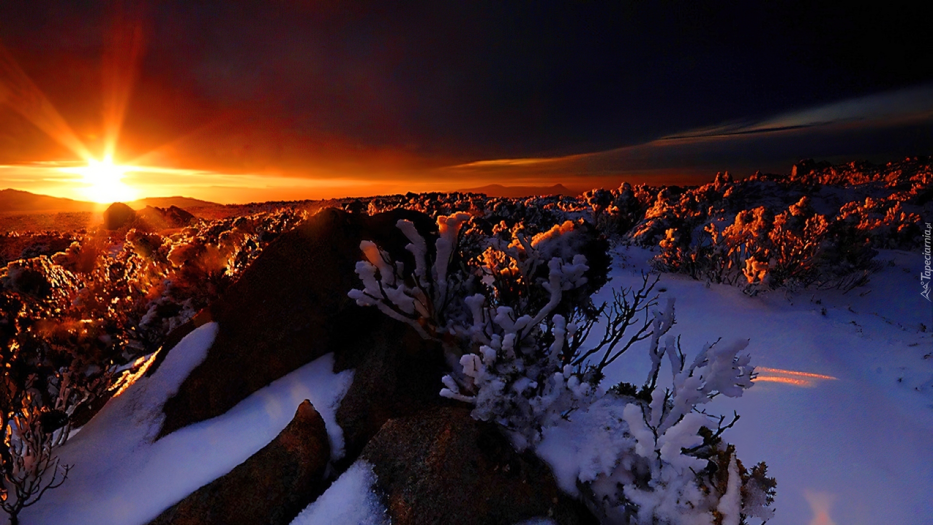 Edytor tapety: Zachód Słońca, Skały, Ośnieżone, Gałązki