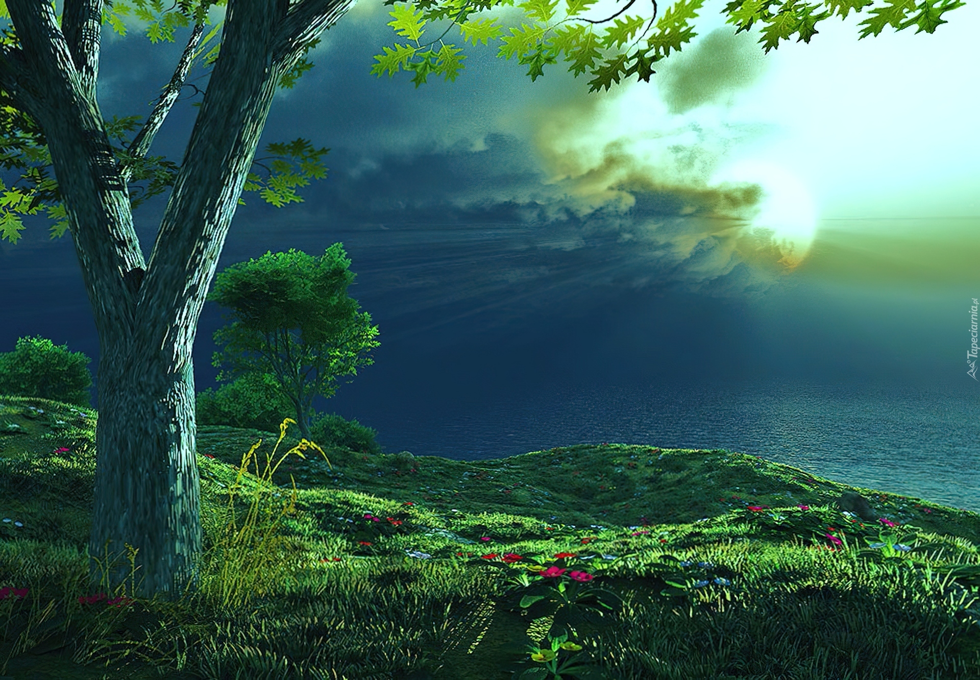 Edytor tapety: Drzewa, Morze, Słońce, W, Chmurach