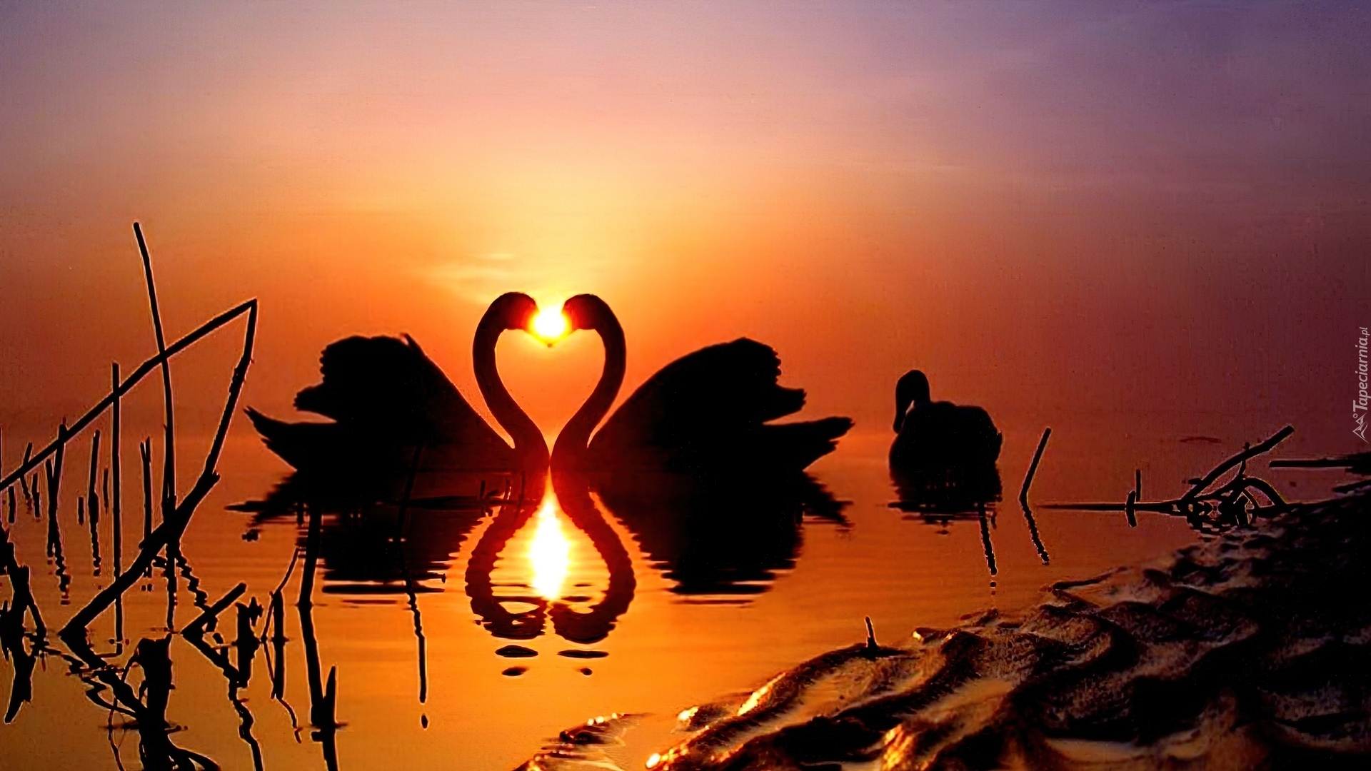 Edytor tapety: Jezioro, Zachód Słońca, Łabędzie