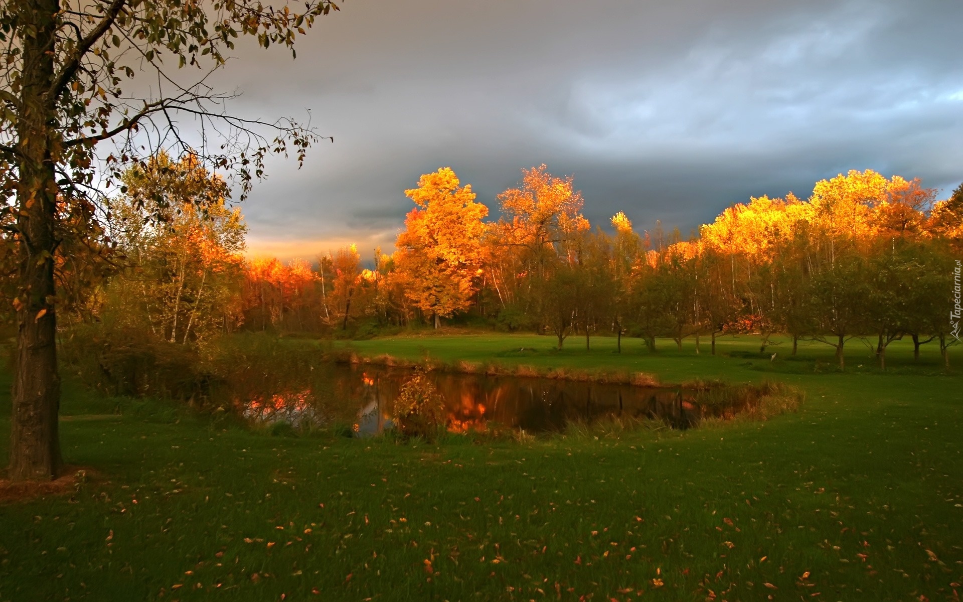 Edytor tapety: Burzowe, Niebo, Złote, Drzewa, Staw