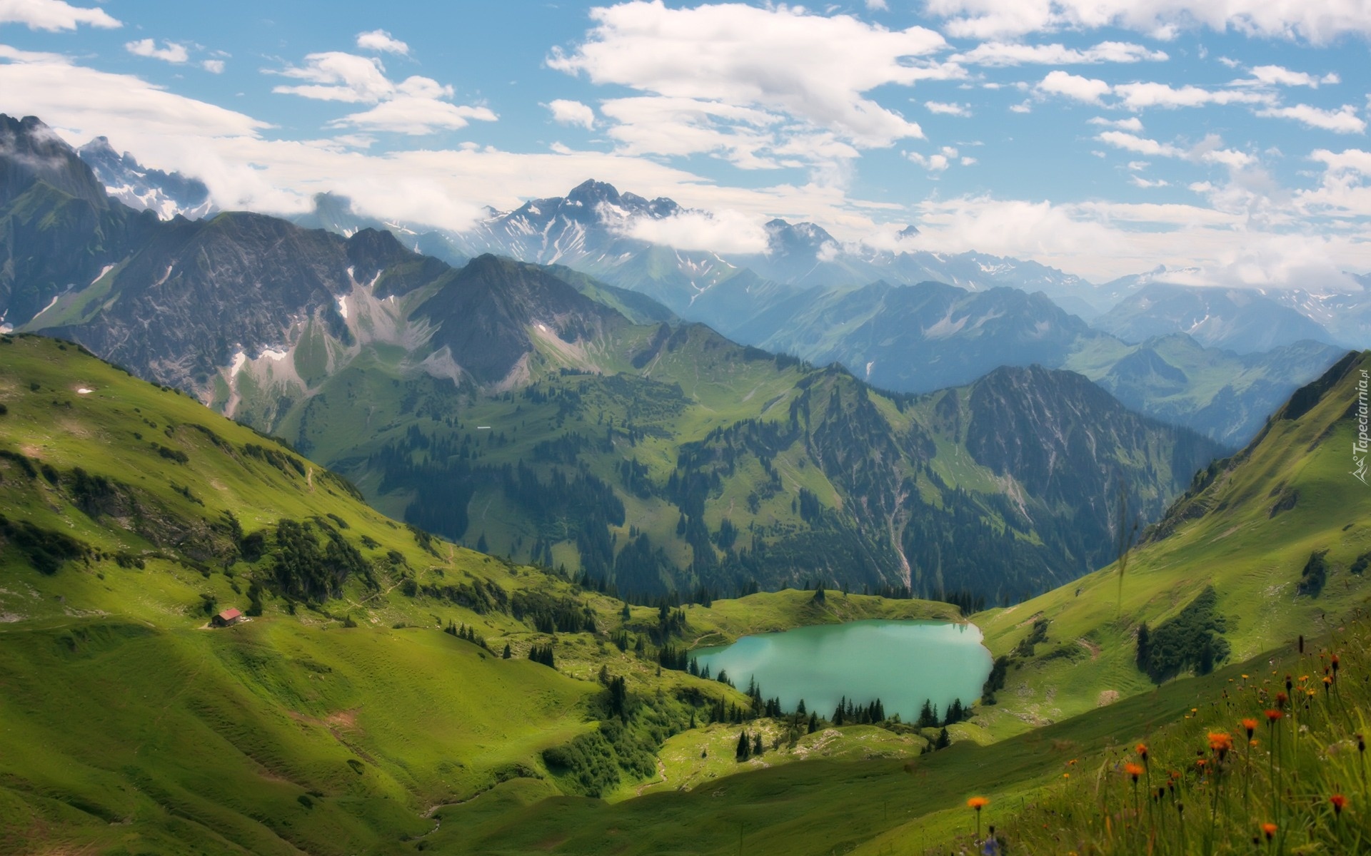 Edytor tapety: Szczyty, Górskie, Łąki, Jeziorko