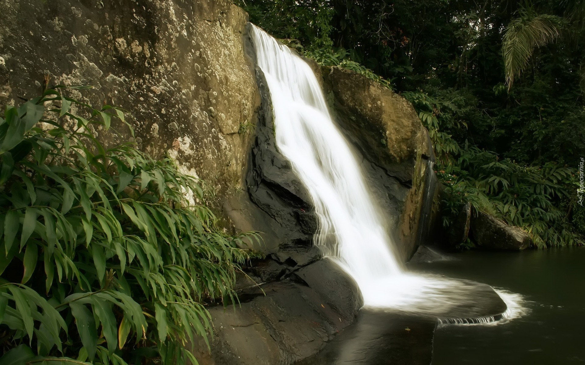 Edytor tapety: Zielone, Krzewy, Rzeka, Wodospad, Skała