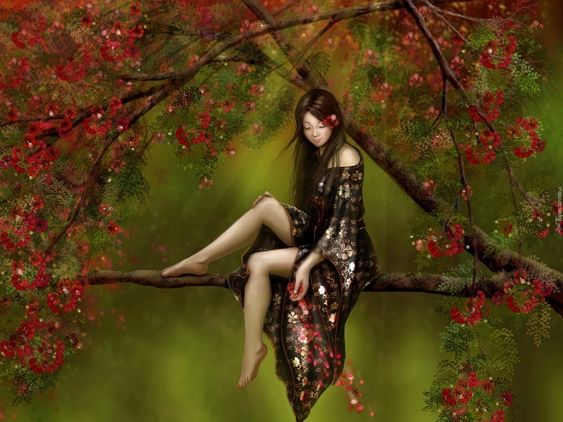 Edytor tapety: Drzewo, Kwiatki, Kobieta