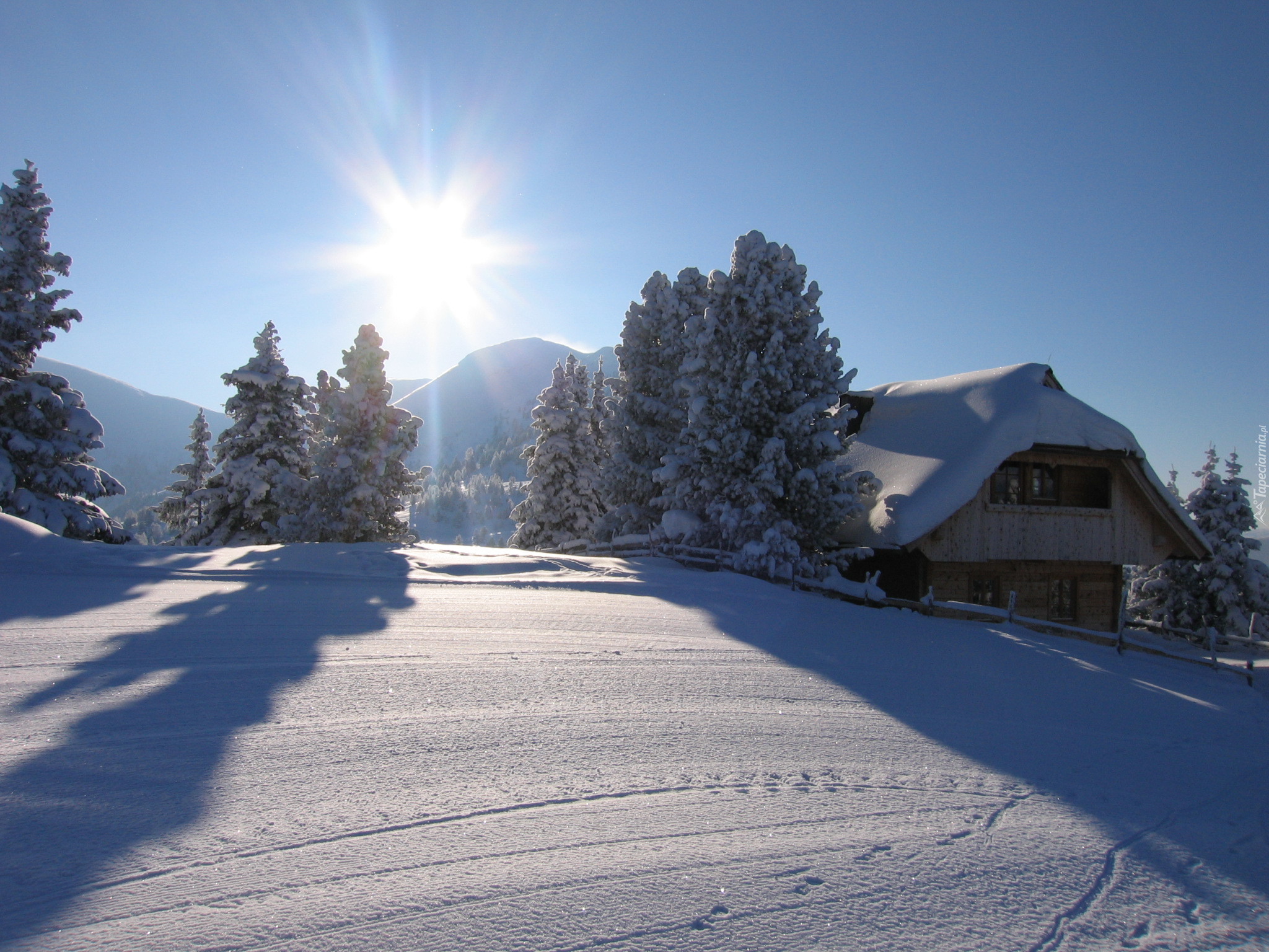 Edytor tapety: Zima, Ośnieżone, Drzewa, Dom, Przebijające, Światło