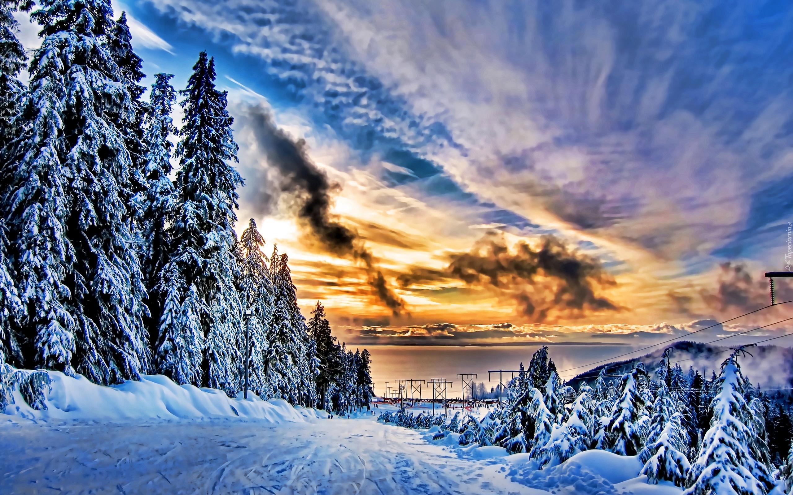 Edytor tapety: Zachód Słońca, Drzewa, Śnieg