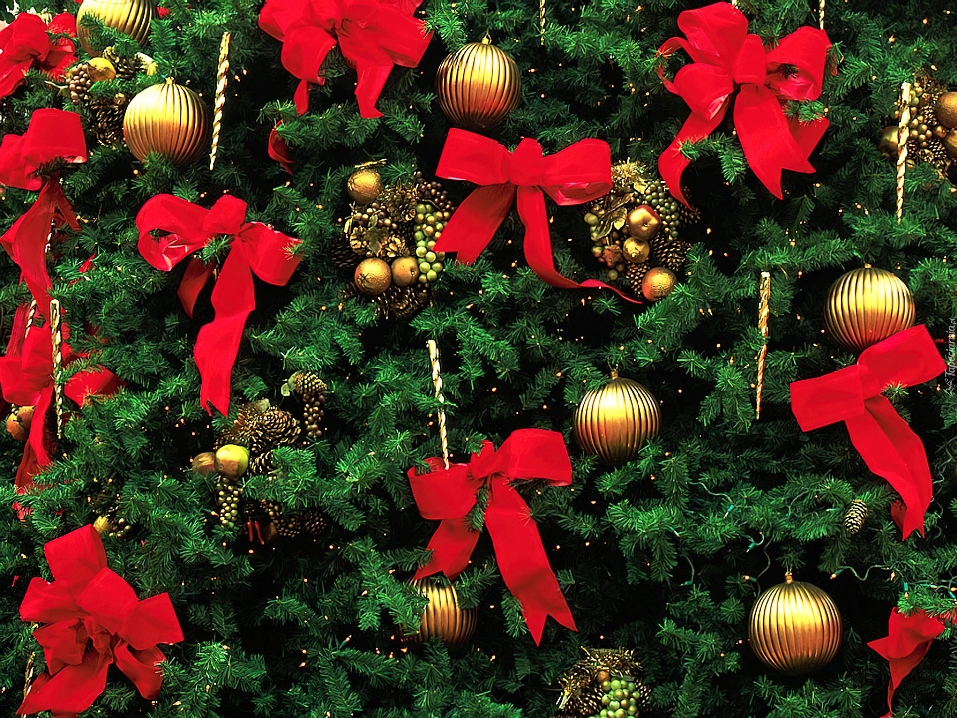 Edytor tapety: Choinka, Czerwone, Kokardki, Bombki