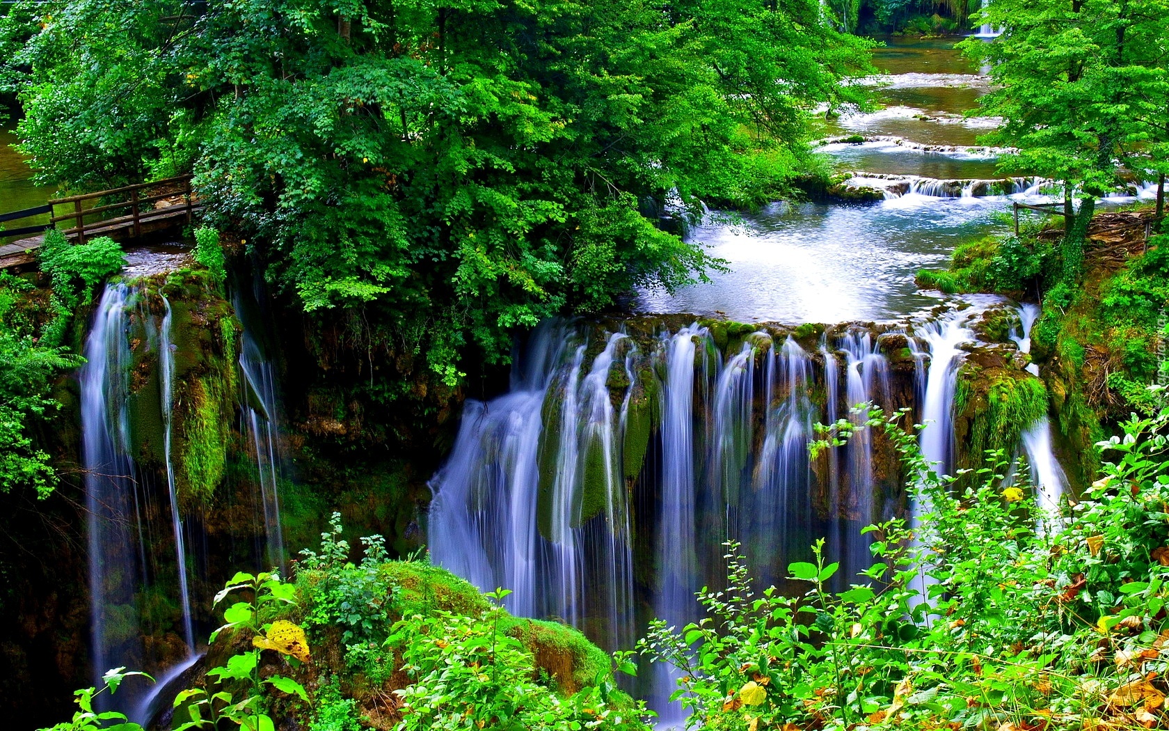 Edytor tapety: Piękny, Wodospad, Drzewa, Mostek