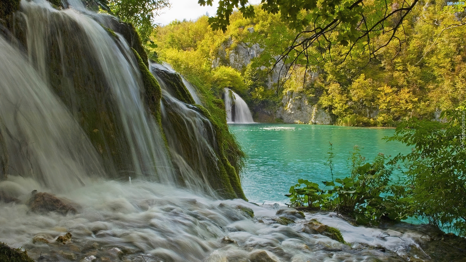 Edytor tapety: Wodospad, Jeziorko, Drzewa