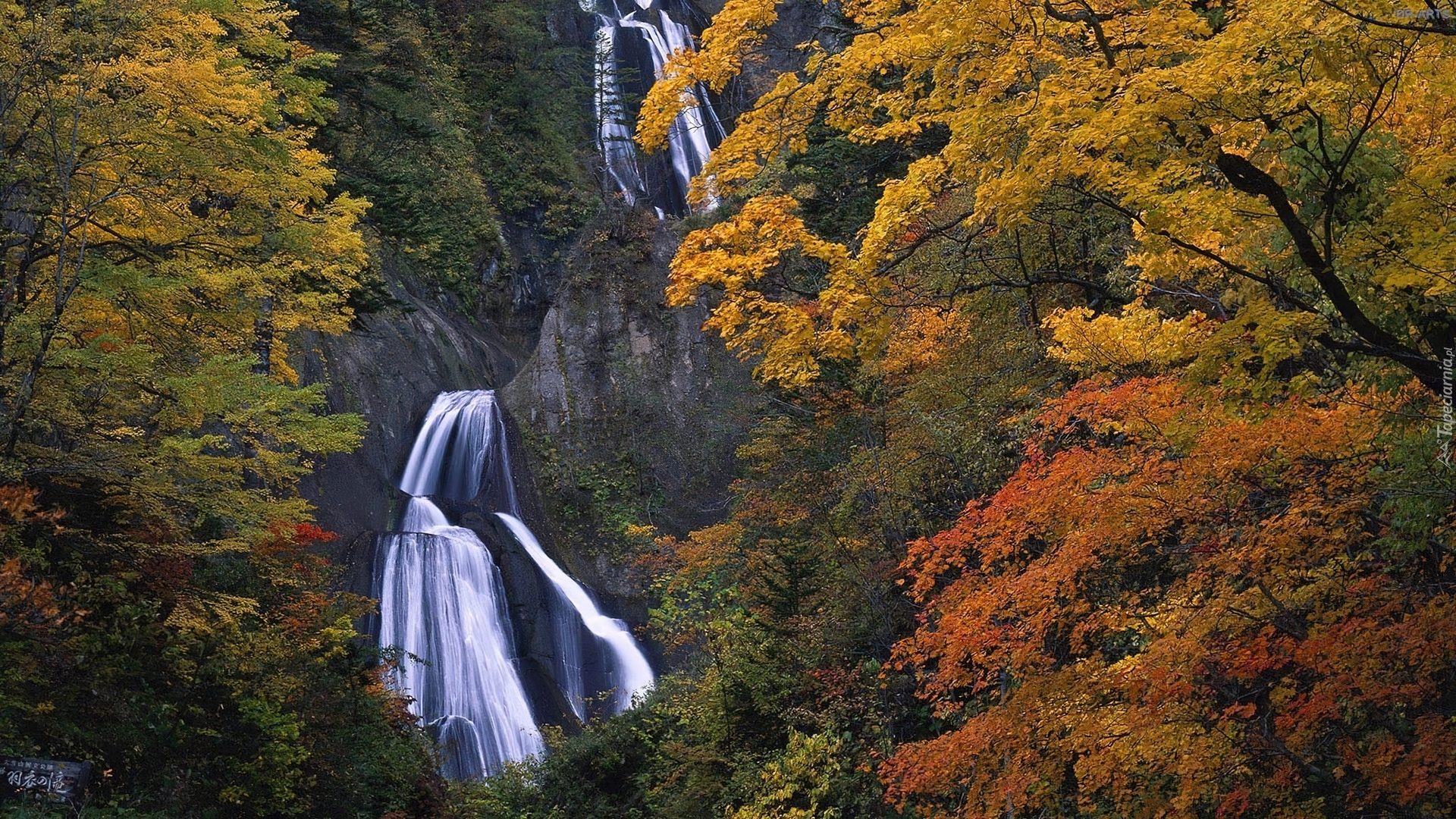 Edytor tapety: Jesień, Wodospad, Skały, Drzewa