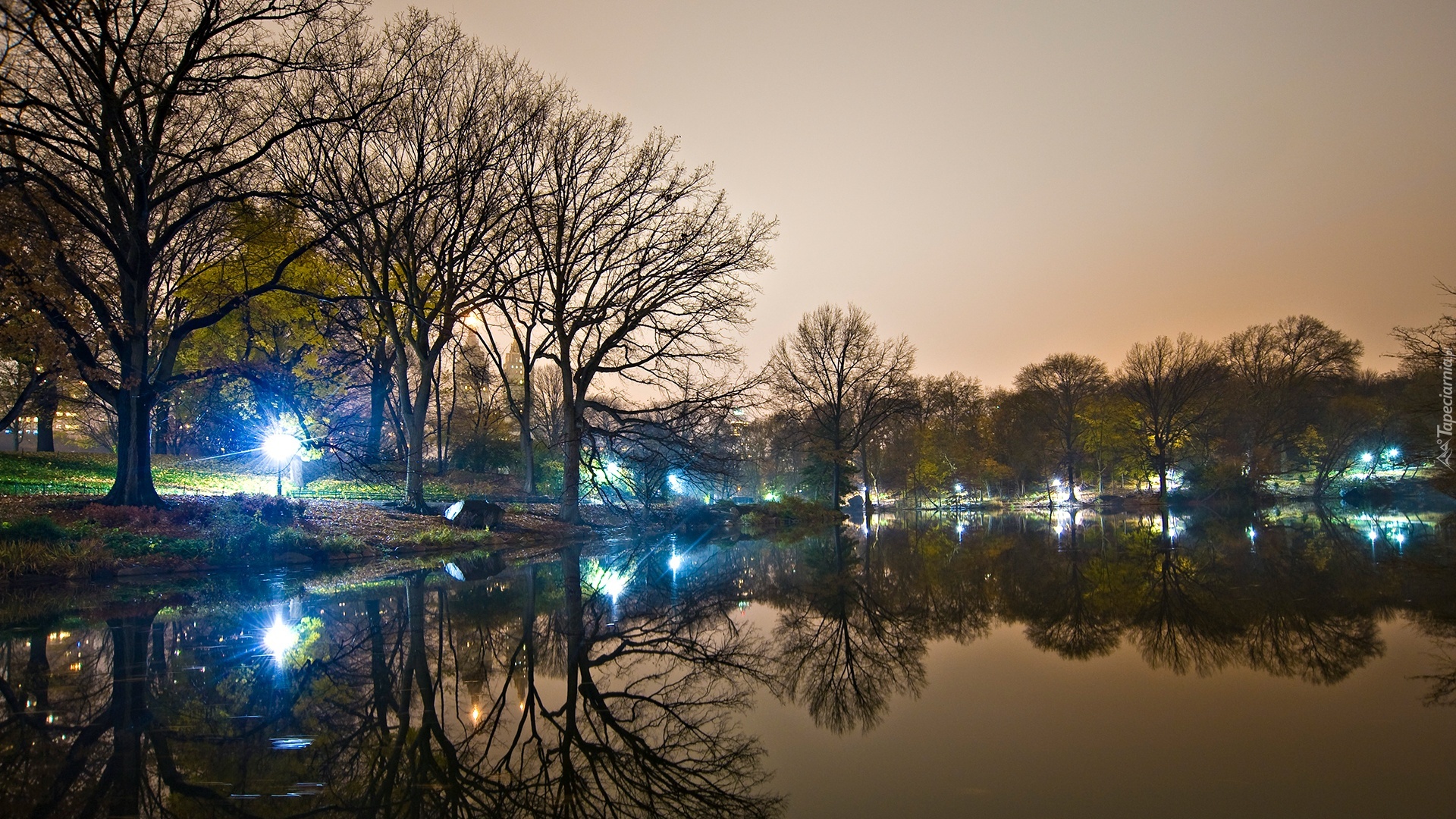 Edytor tapety: Zmierzch, Oświetlony, Park, Jezioro