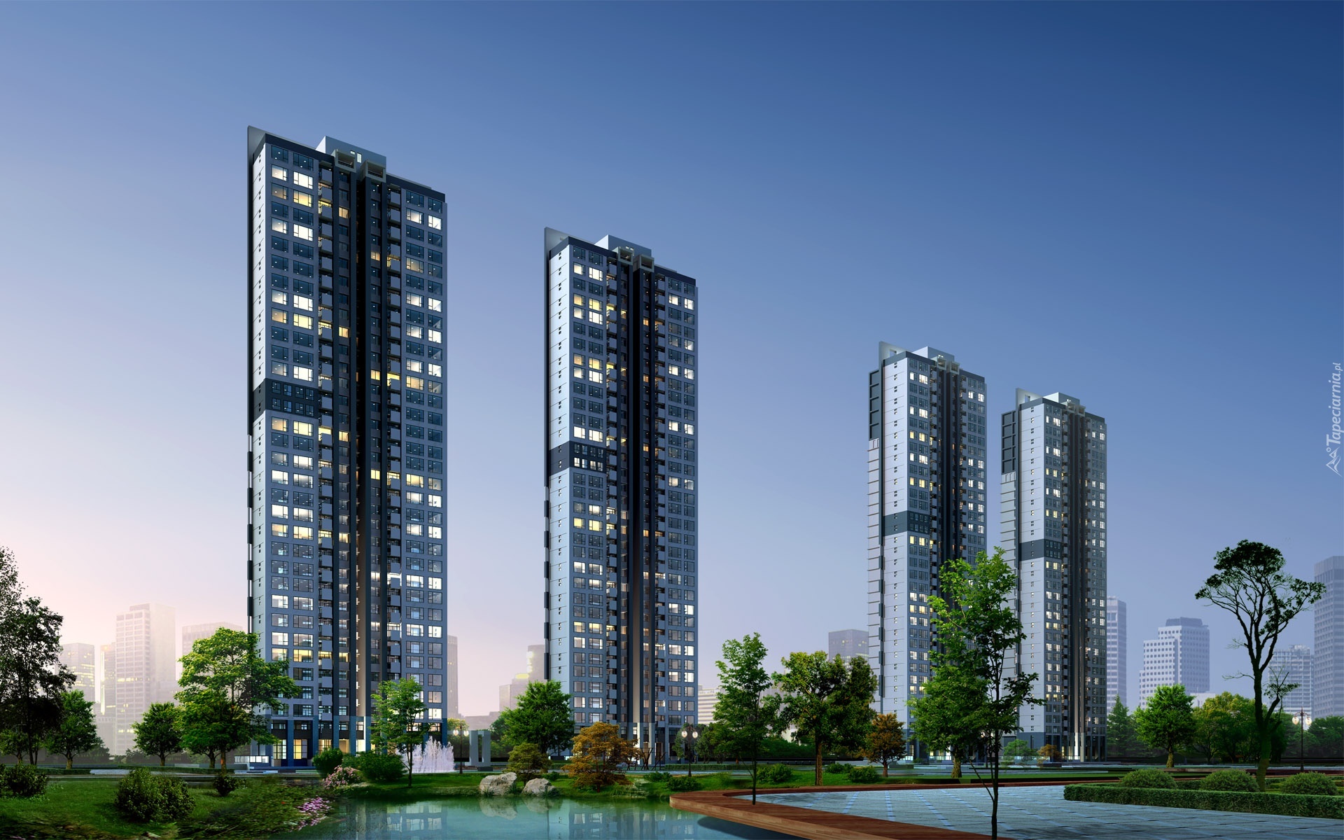 Edytor tapety: Wieżowce, Park, Drzewa, Jeziorko, Projekt