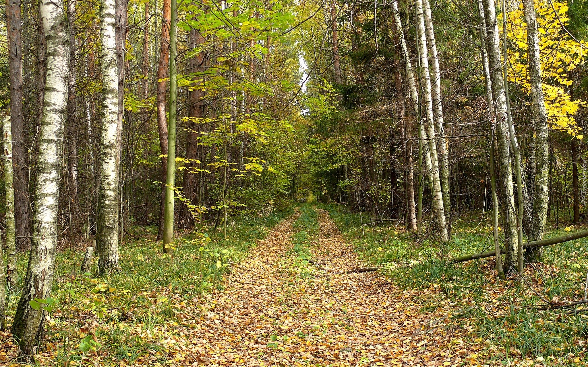 Edytor tapety: Las, Droga, Brzozy, Liście, Jesień