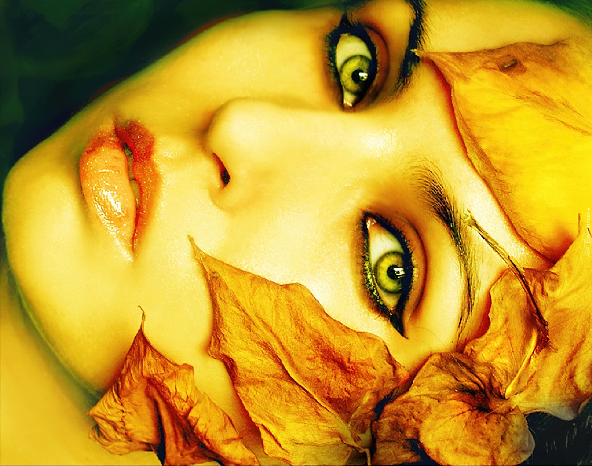 Edytor tapety: Kobieta, Twarz, Żółte, Liście, Makijaż