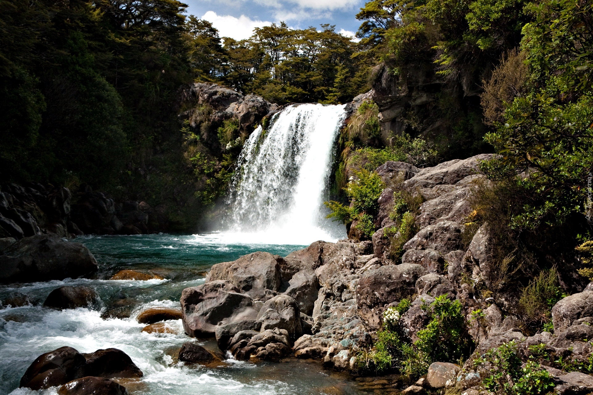 Edytor tapety: Wodospad, Drzewa, Kamienie