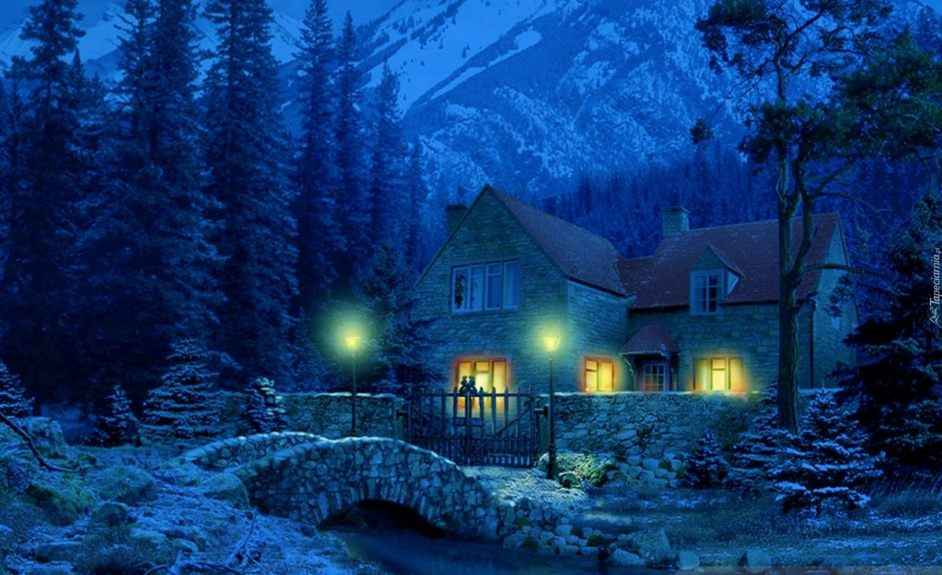 Edytor tapety: Zima, Oświetlony, Domek, Mostek, Strumyk