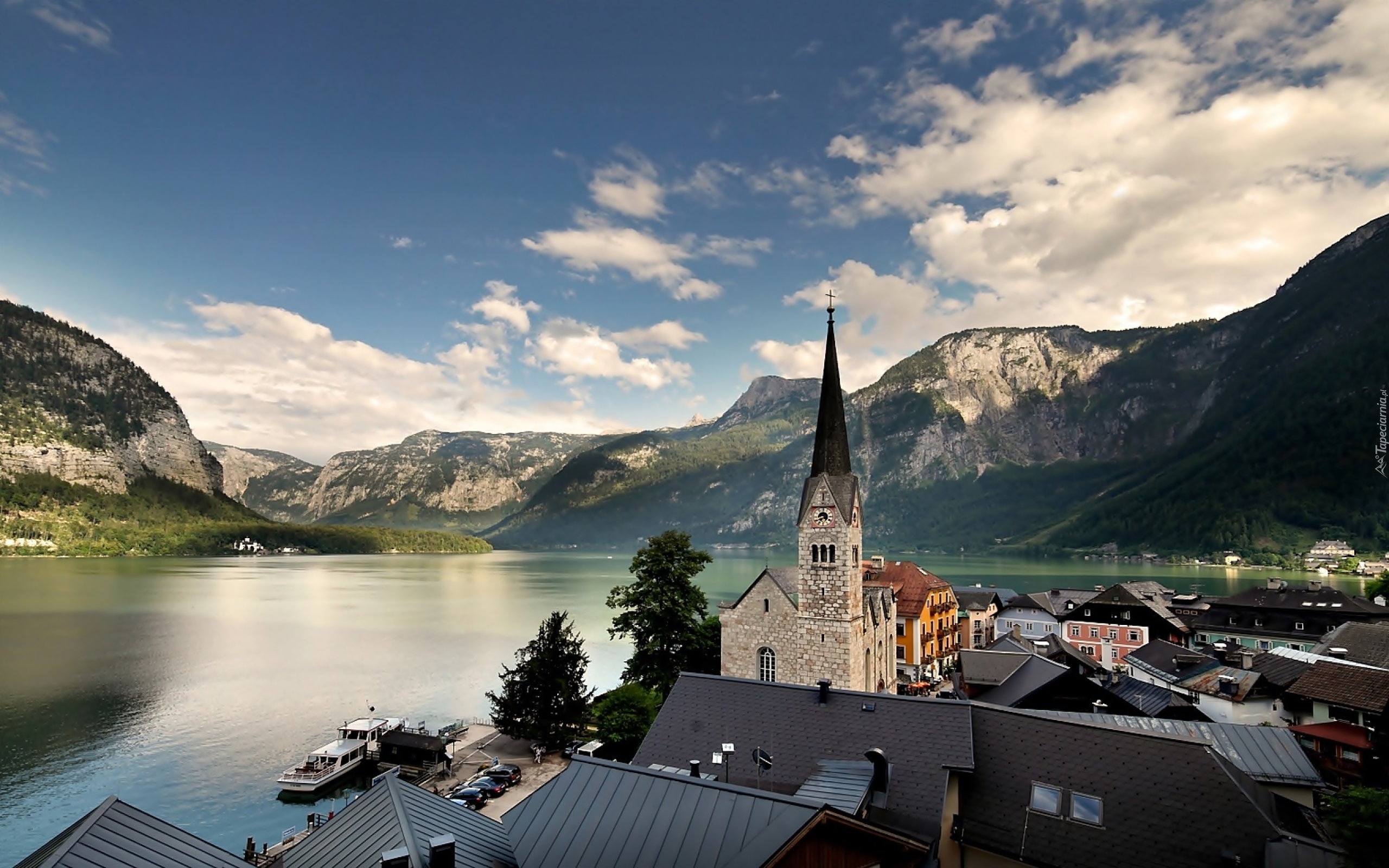 Edytor tapety: Jezioro, Góry, Miasteczko, Kościółek