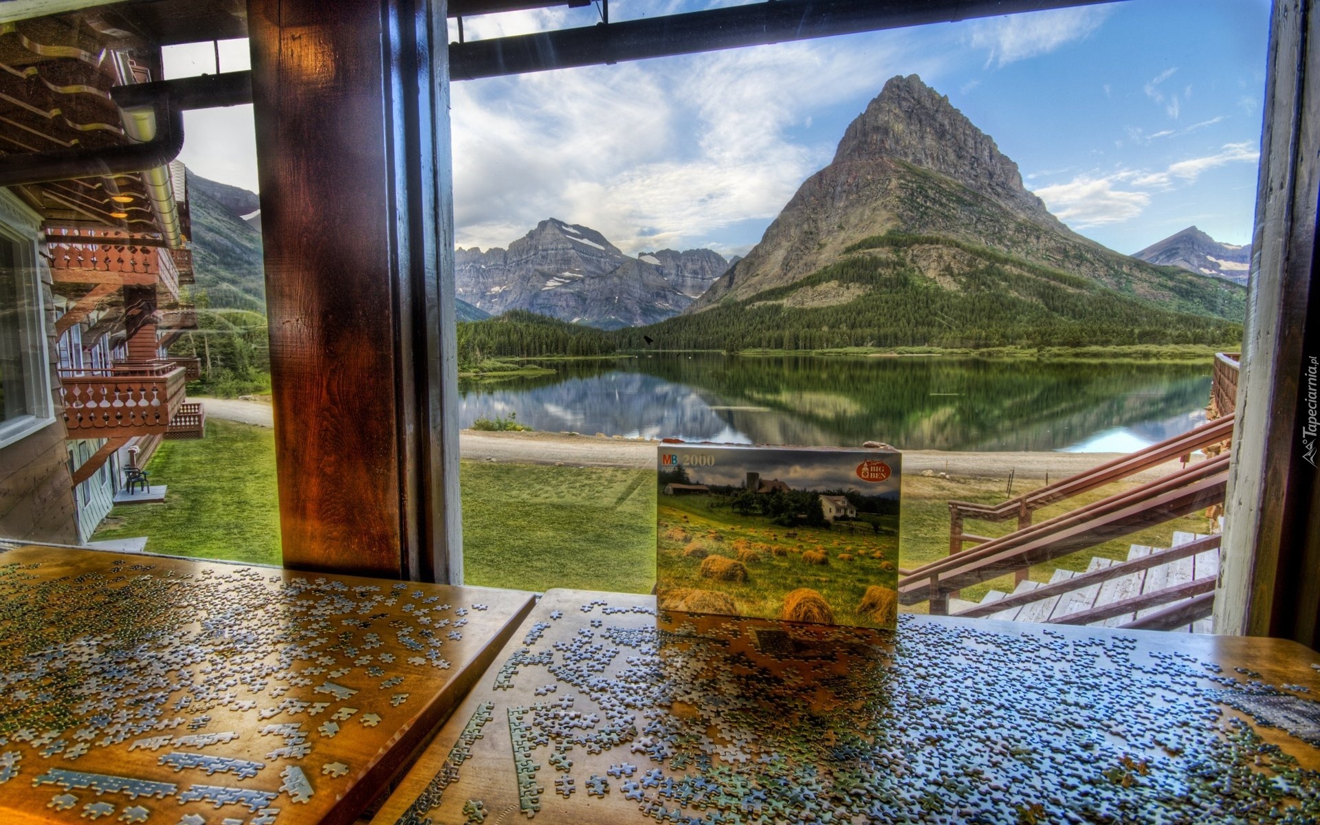 Edytor tapety: Puzzle, Widok, Z, Okna, Góry, Jezioro