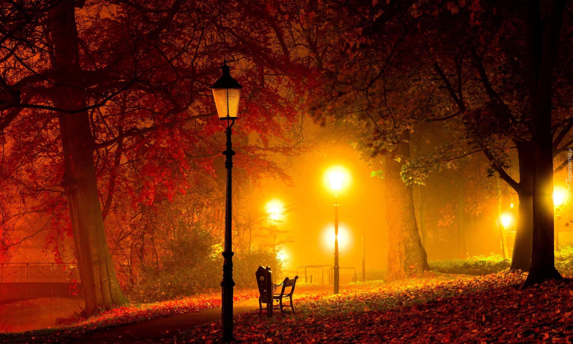 Edytor tapety: Drzewa, Liście, Park, Nocą, Latarnie
