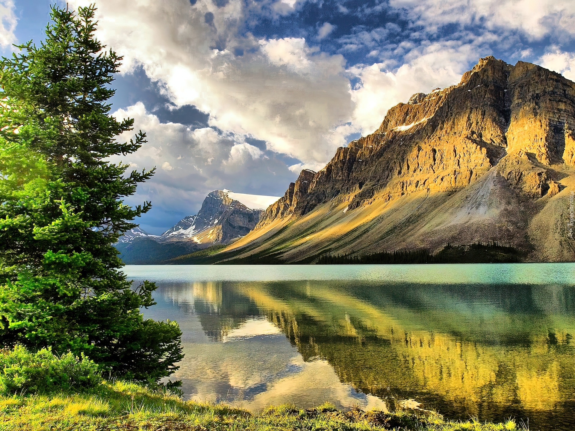 Edytor tapety: Góry, Chmury, Jezioro, Choinka