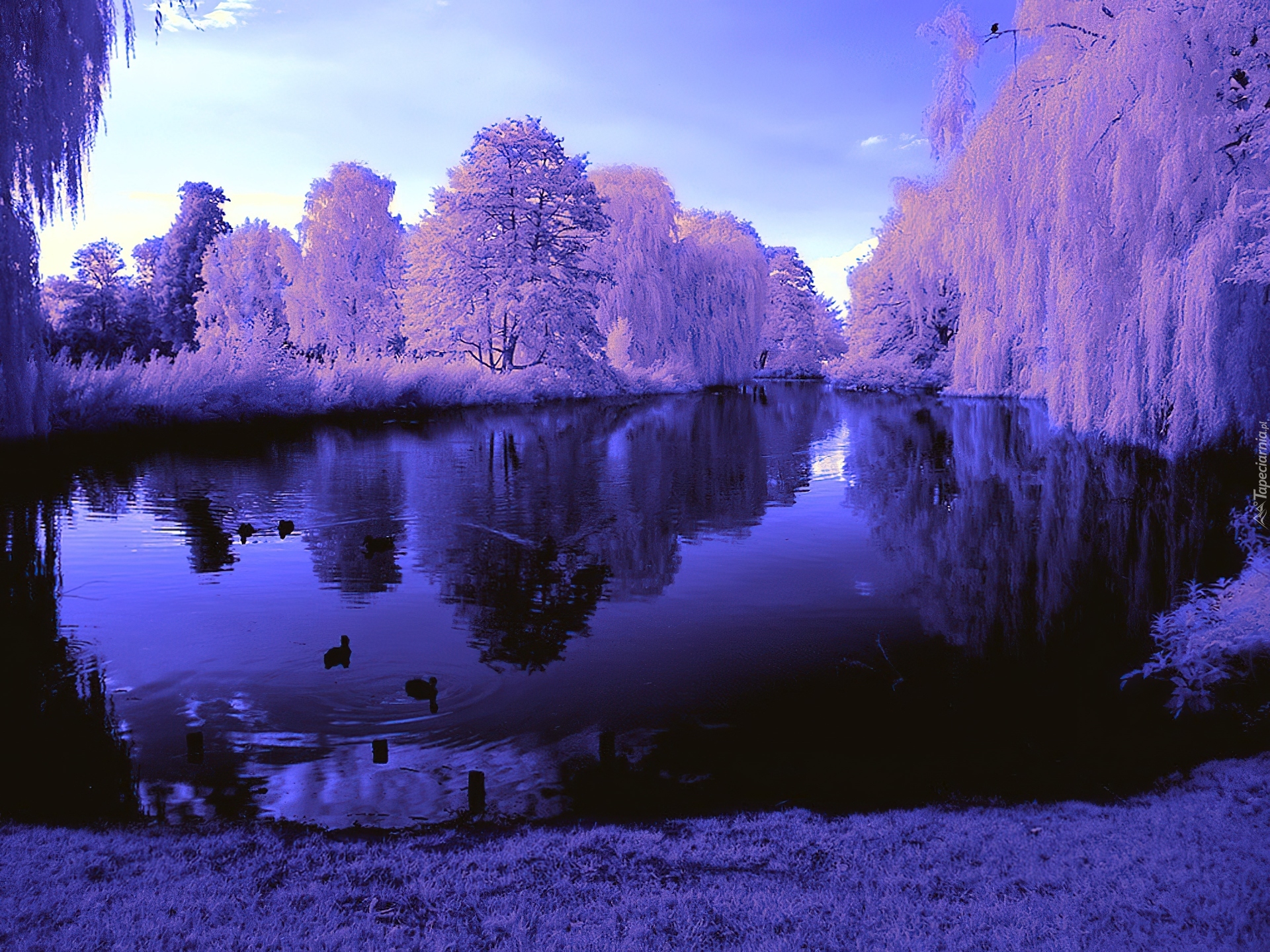 Edytor tapety: Jezioro, Ośnieżone, Drzewa, Świt