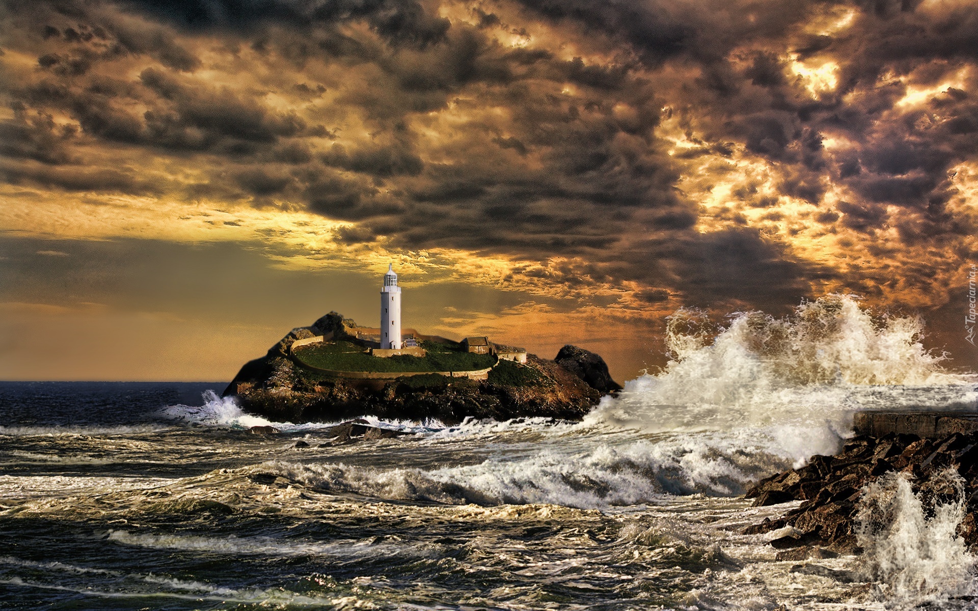 Edytor tapety: Latarnia Morska, Zachód Słońca, Morze, Fale