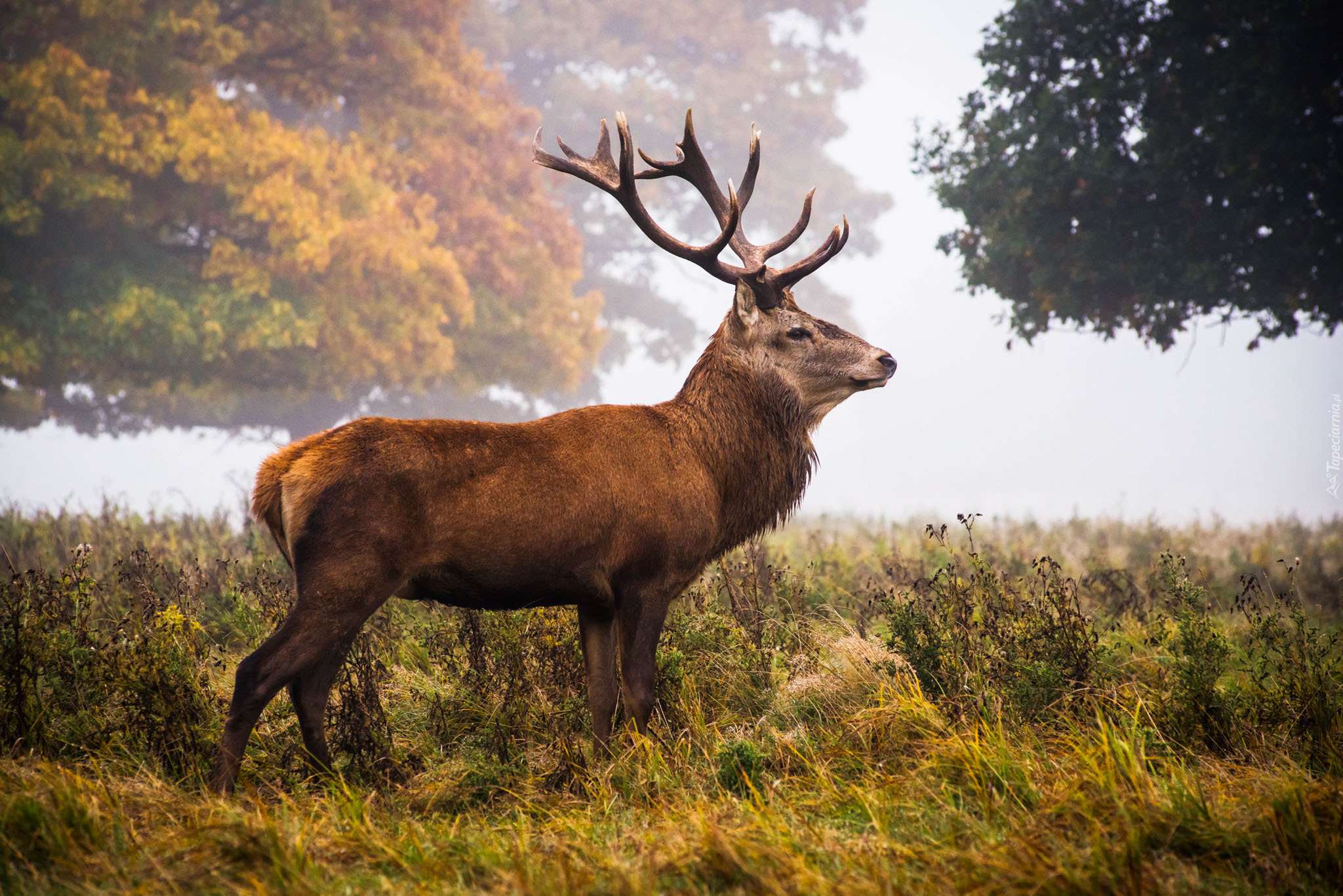 Edytor tapety: Jeleń, Łąka, Drzewa, Mgła