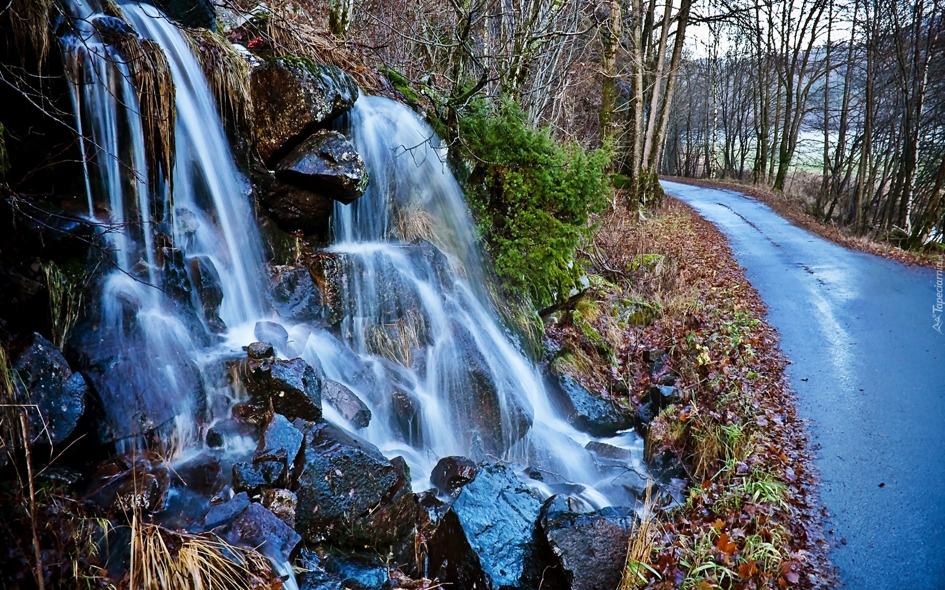 Edytor tapety: Wodospad, Kamienie, Droga, Drzewa