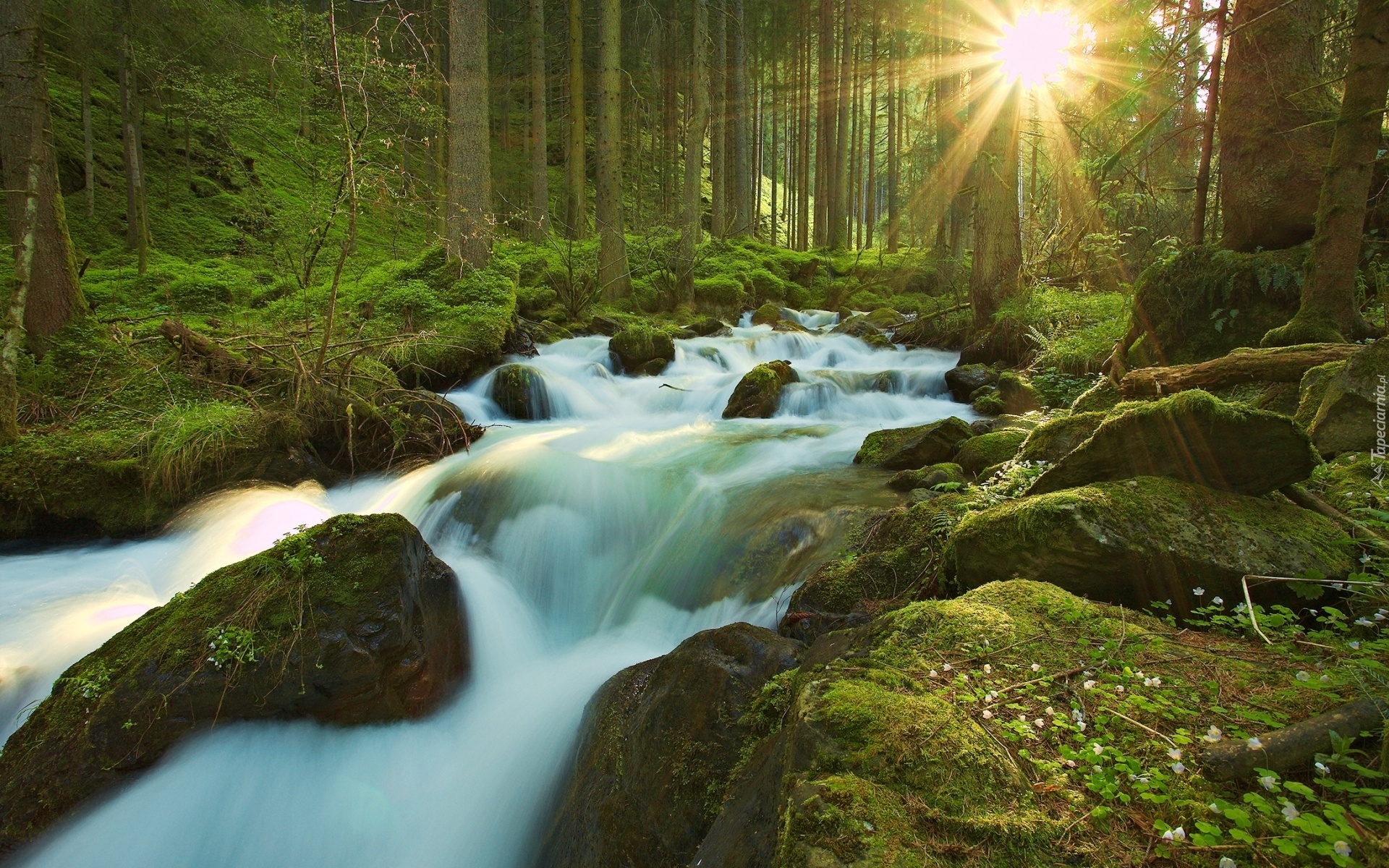 Edytor tapety: Wodospad, Las, Promienie Słońca, Rzeka