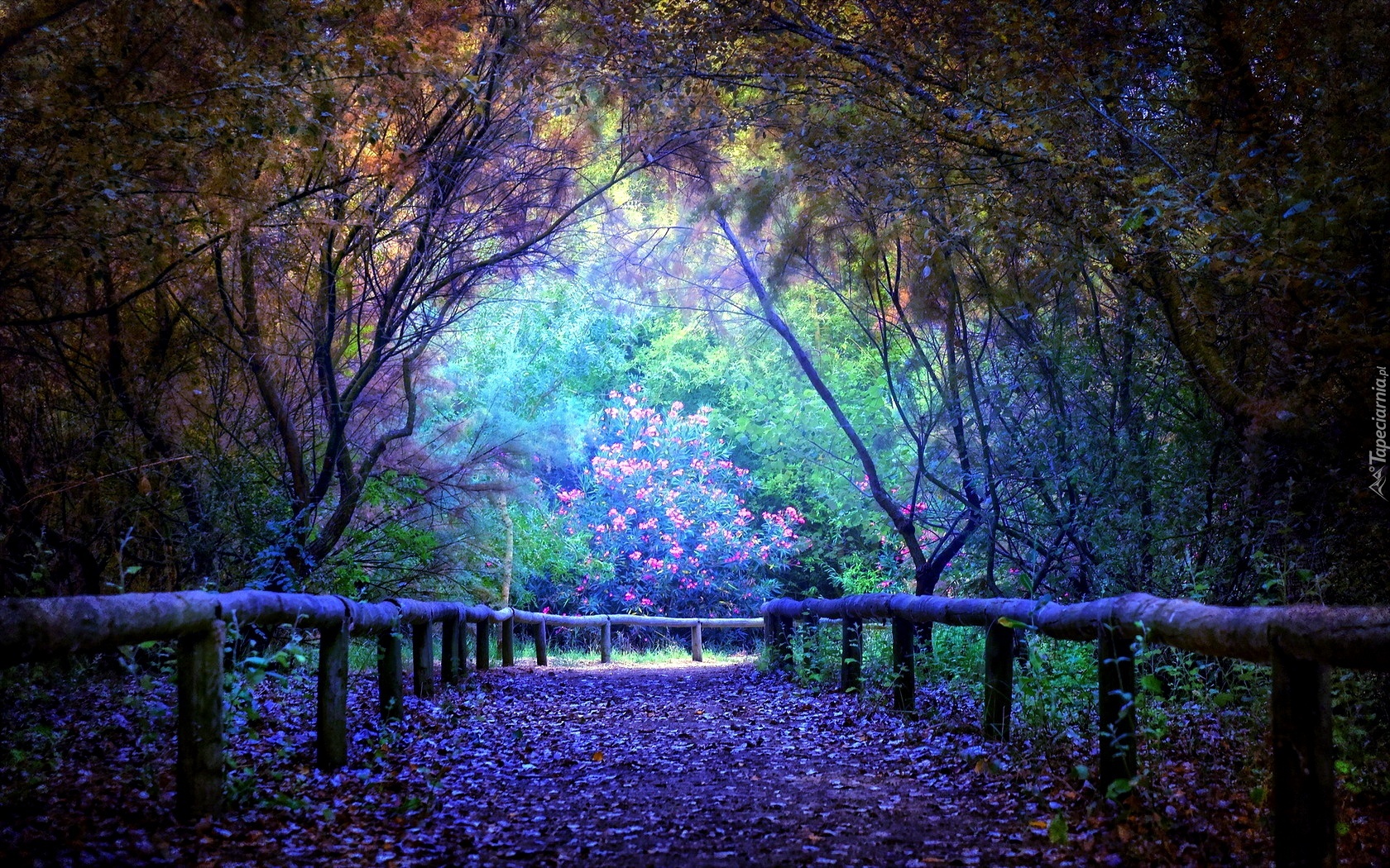 Edytor tapety: Las, Droga, Płotek, Liście