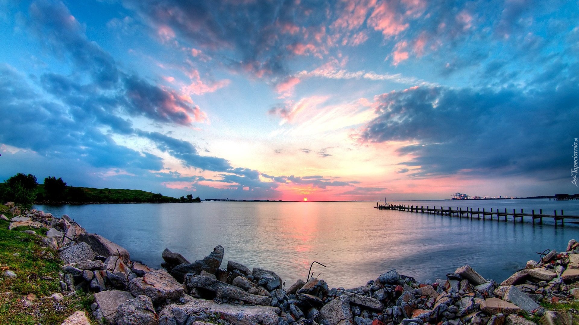 Edytor tapety: Jezioro, Kamienie, Pomost, Zachód Słońca