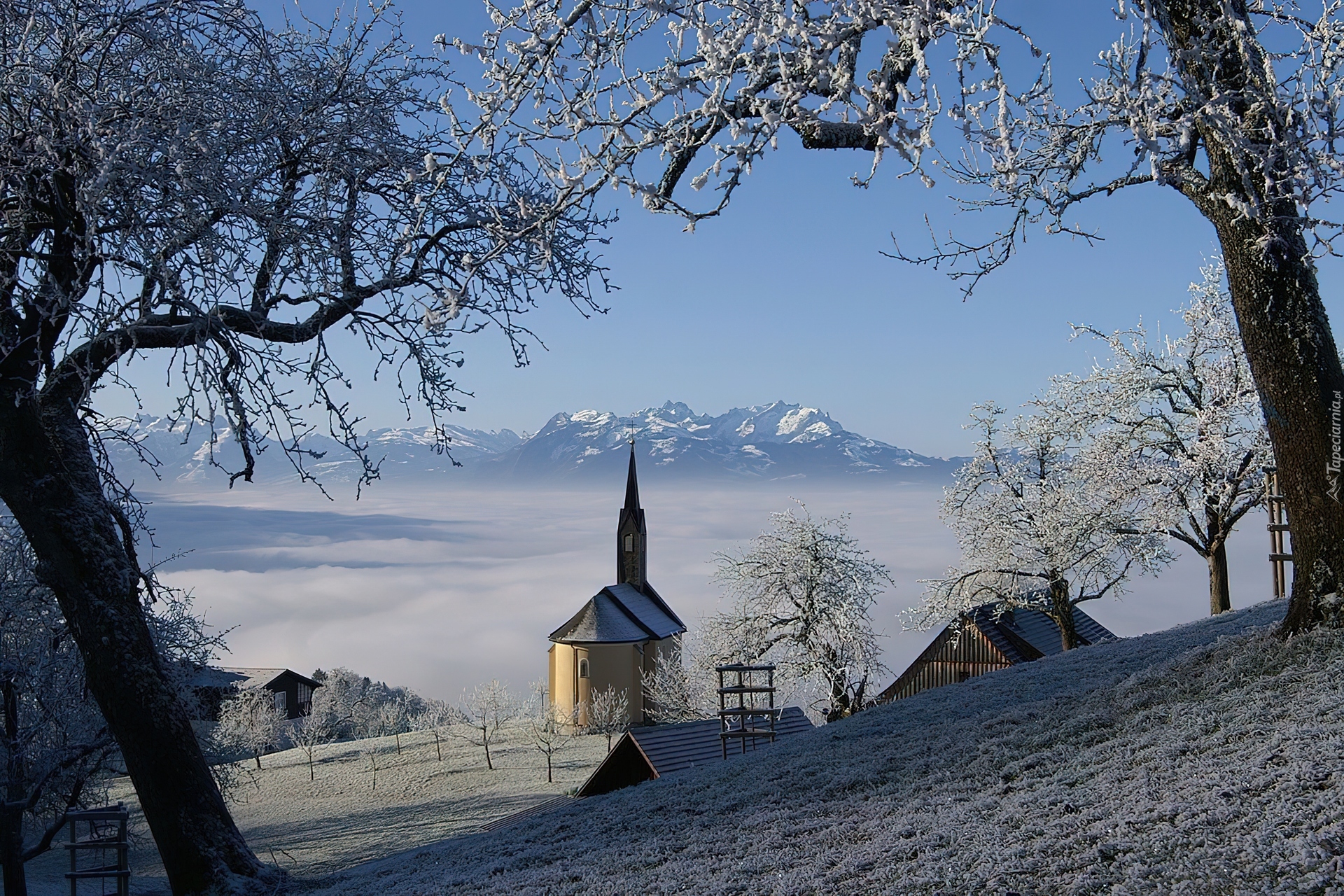 Edytor tapety: Zima, Kościółek, Drzewa, Austria
