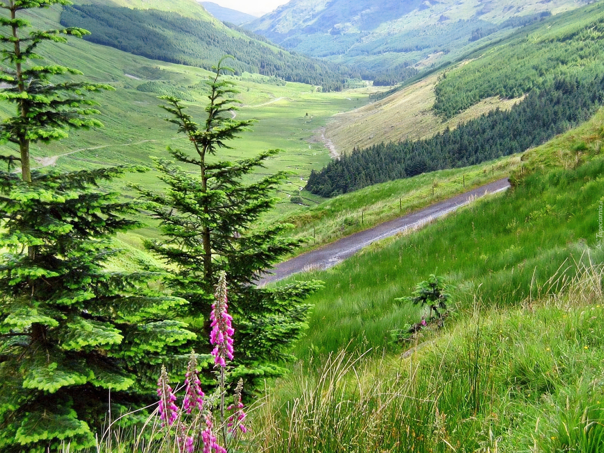 Edytor tapety: Góry, Droga, Trawa, Świerki