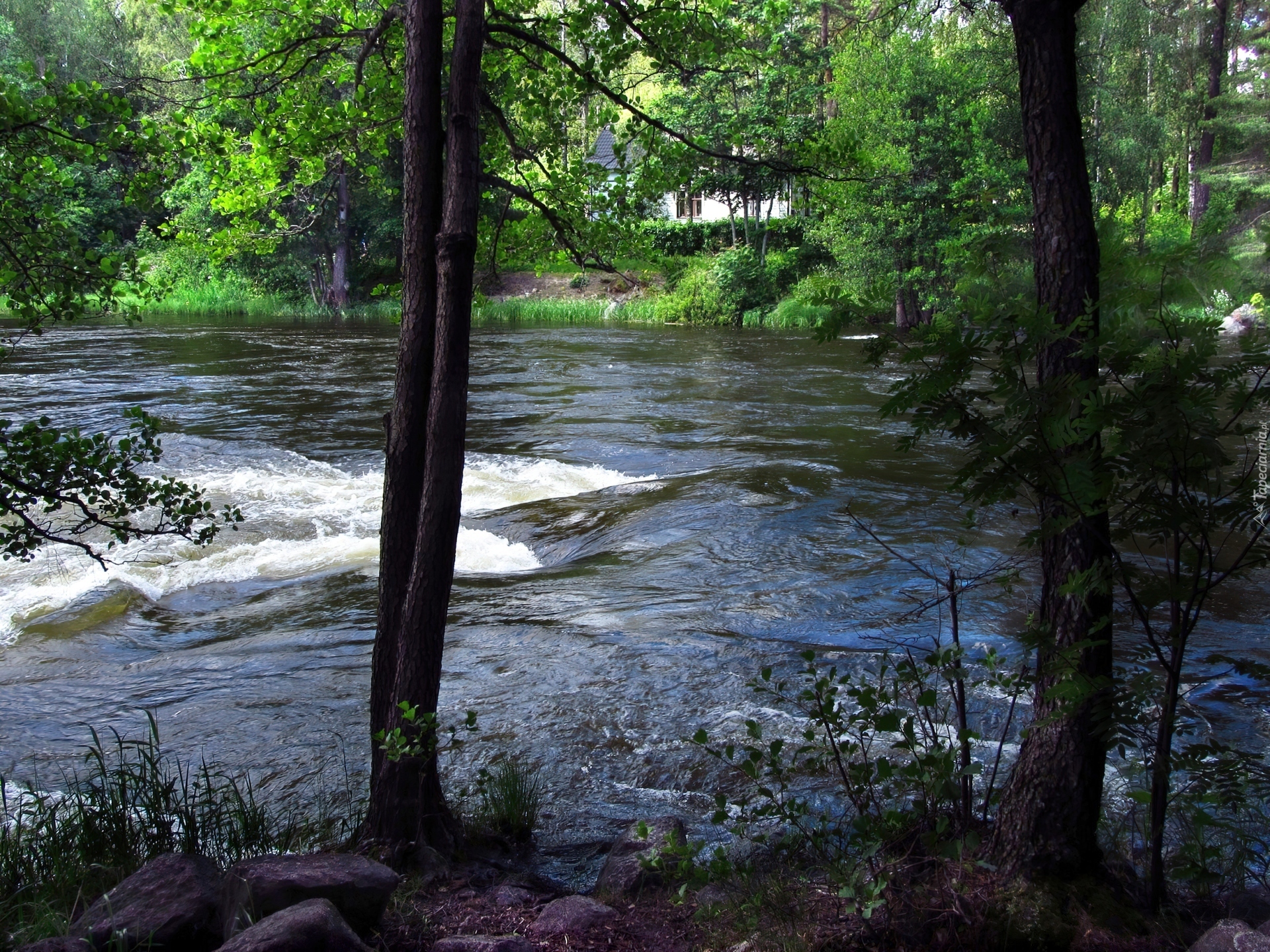 Edytor tapety: Rzeka, Drzewa, Dom
