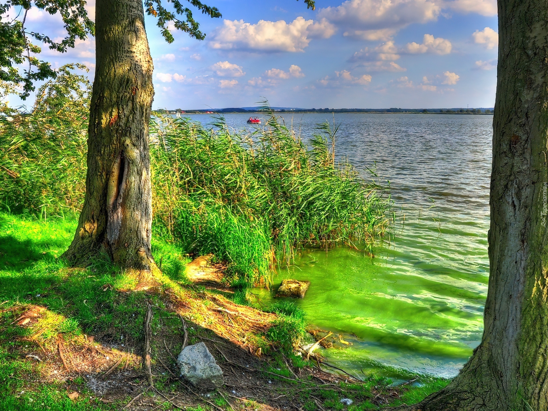 Edytor tapety: Jezioro, Szuwary, Drzewa