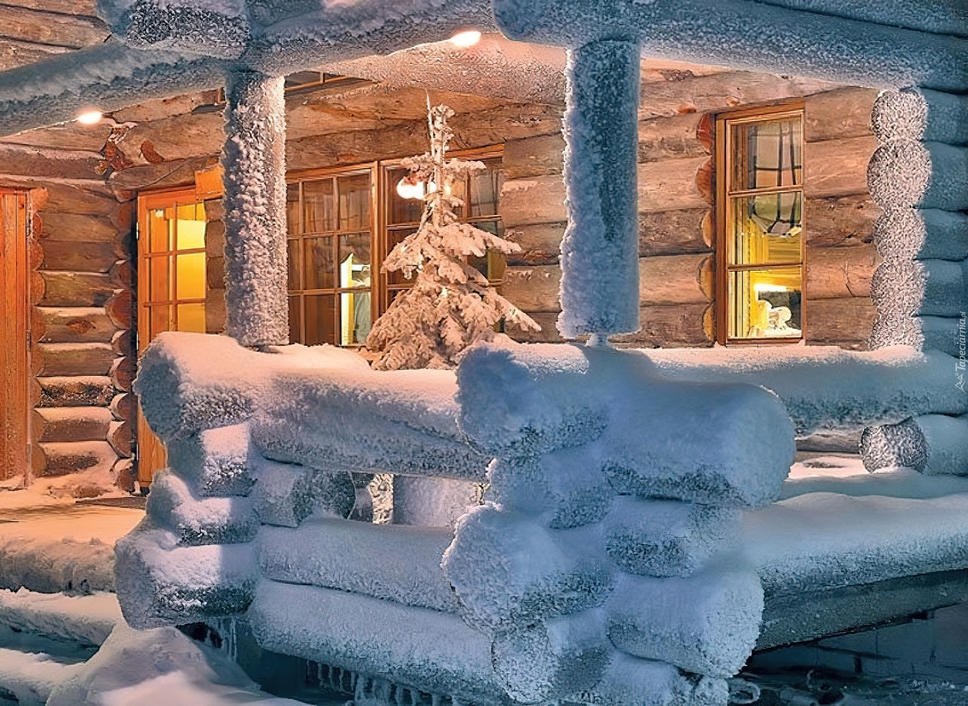 Edytor tapety: Domek, Choinka, Śnieg, Zima