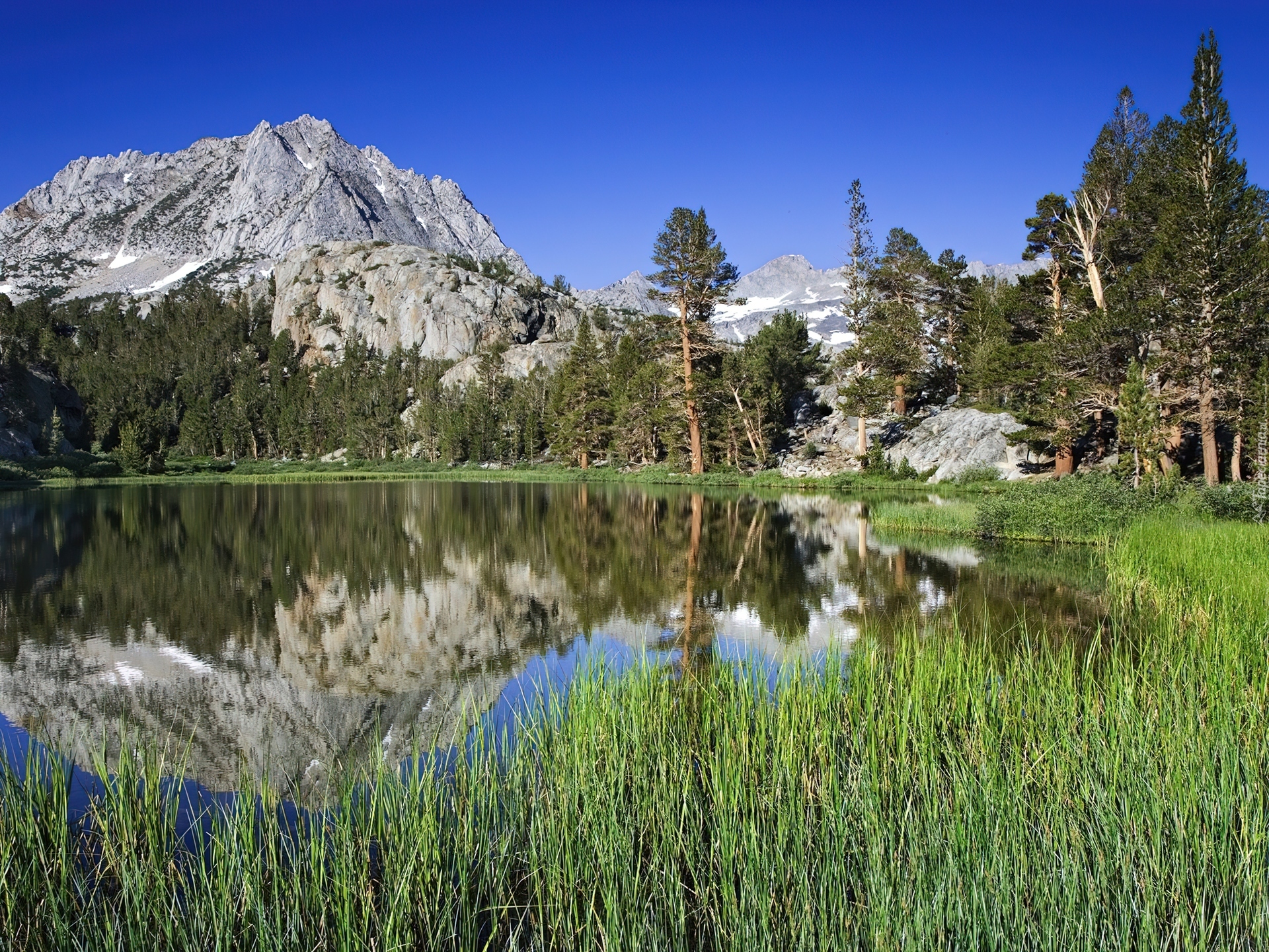 Edytor tapety: Góry, Jezioro, Trawa, Odbicie