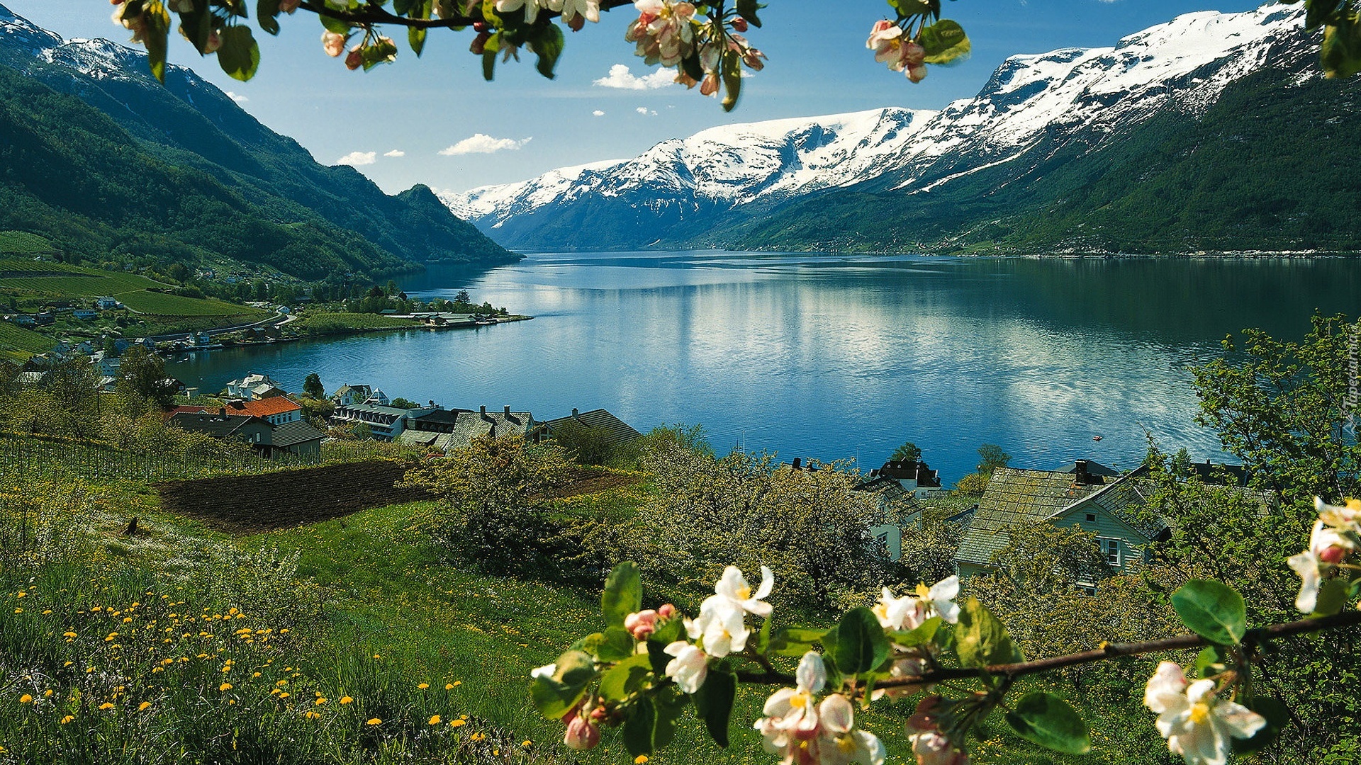 Edytor tapety: Jezioro, Góry, Gałązka, Kwitnącego, Drzewa