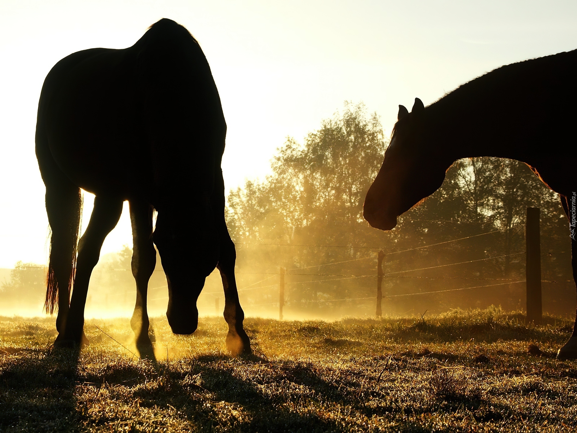 Edytor tapety: Dwa, Konie, Wschód, Słońca, Pastwisko