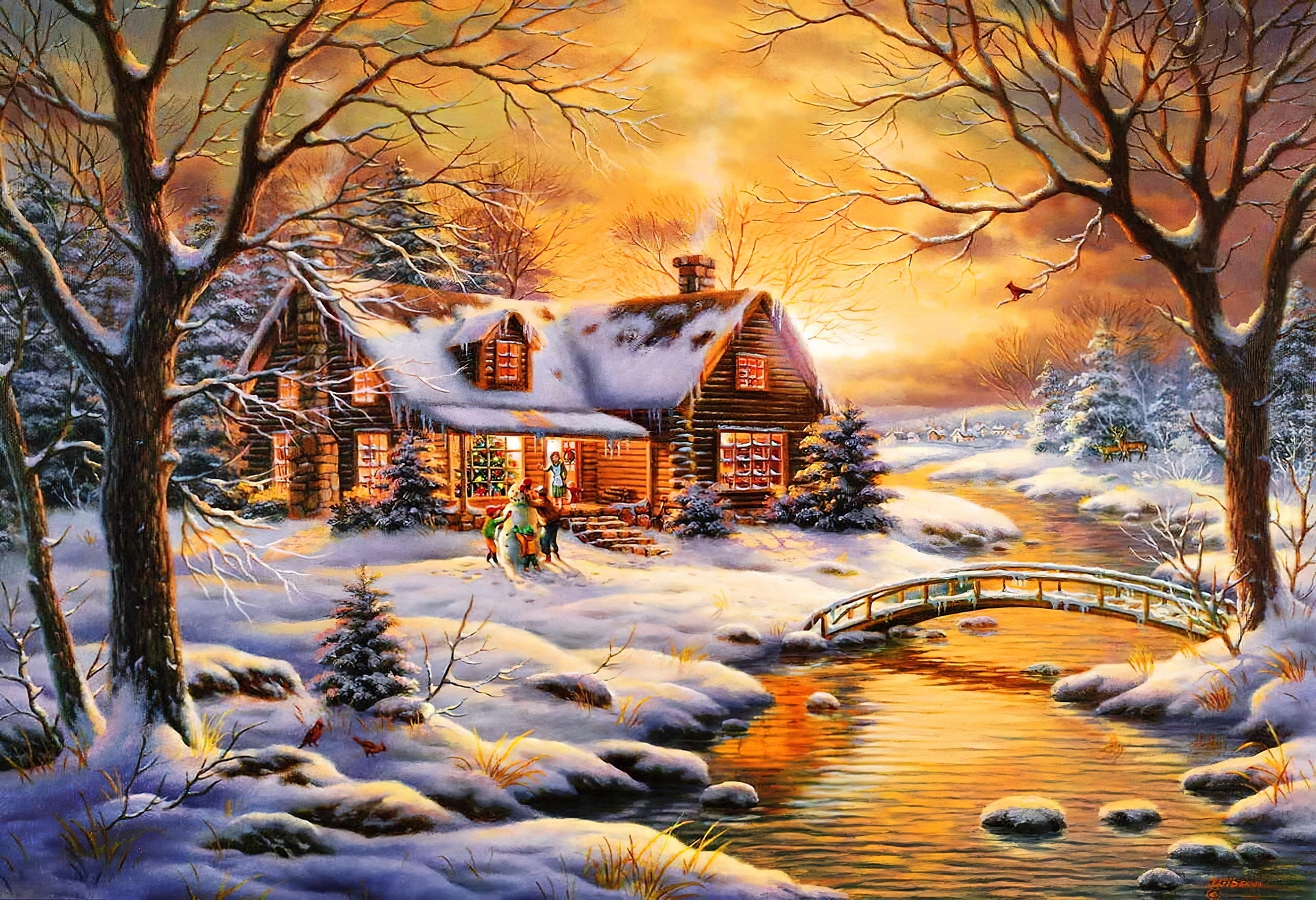 Edytor tapety: Zachód, Słońca, Rzeczka, Domek, Zima