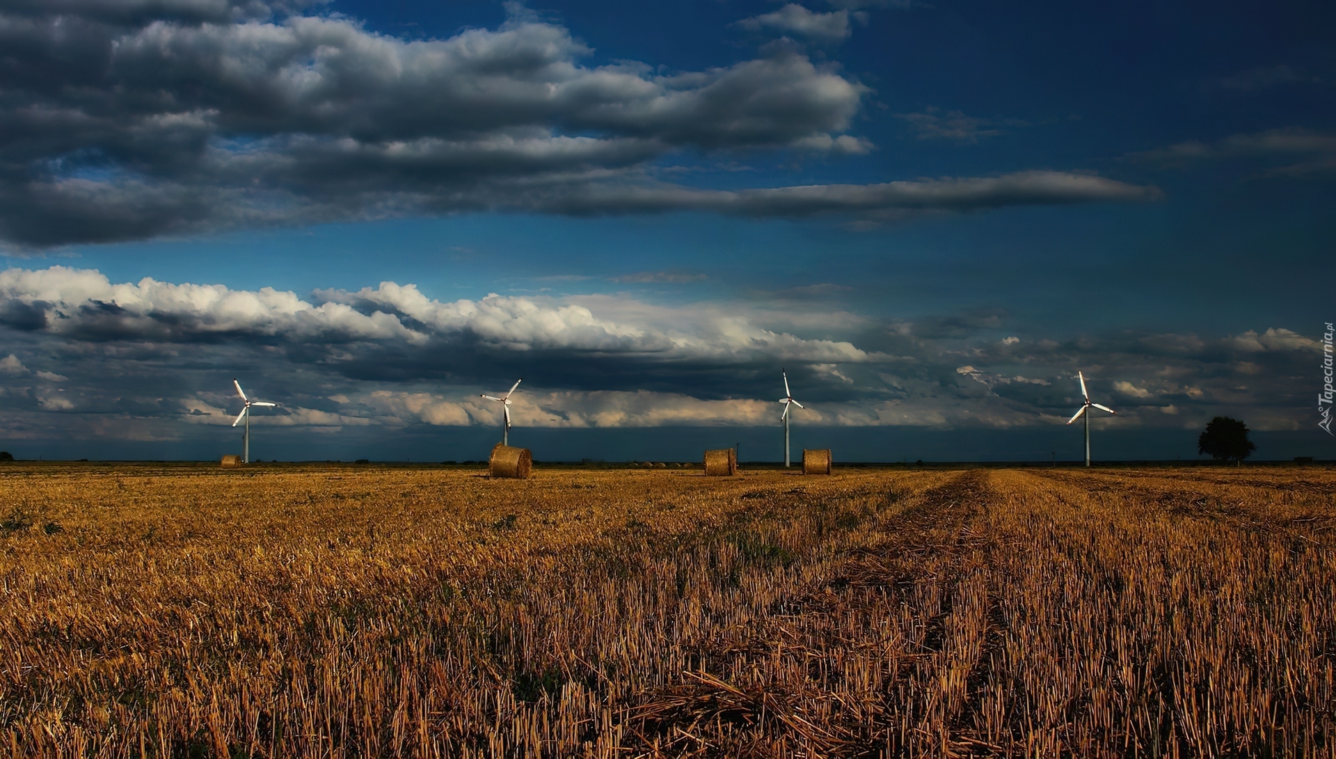 Edytor tapety: Słoma, Ściernisko, Wiatraki, Chmury
