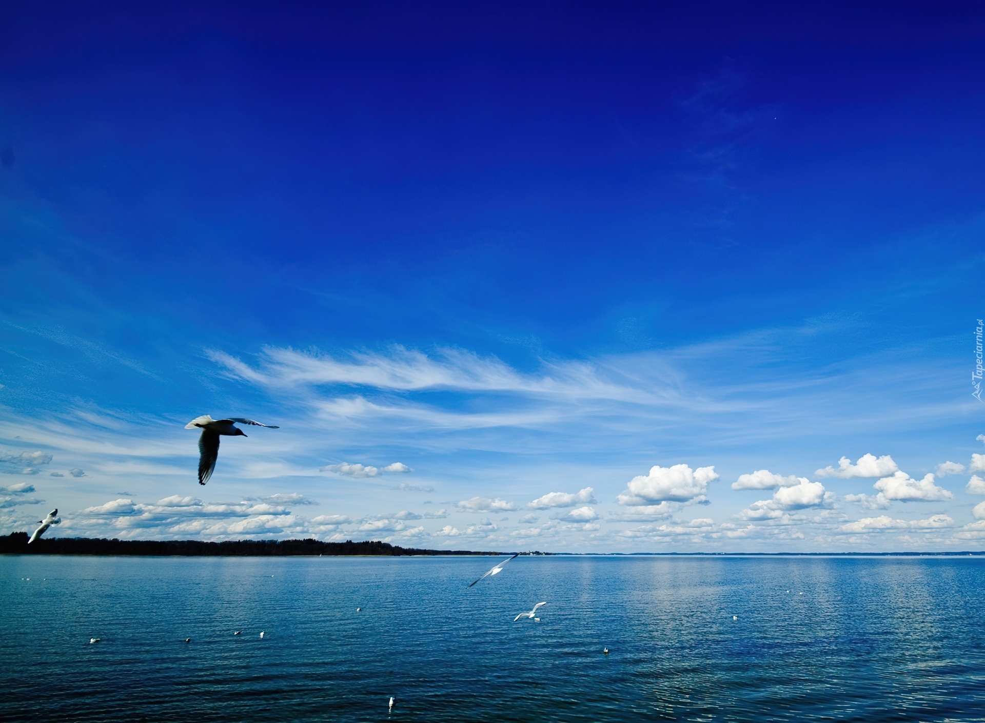 Edytor tapety: Jezioro, Ptaki, Chmury