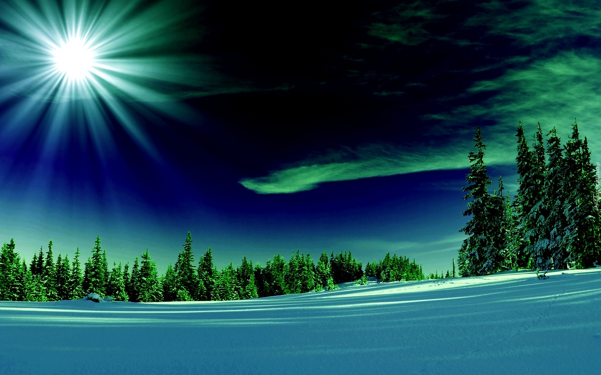 Edytor tapety: Las, Promienie, Śnieg, Zima, Zorza Polarna