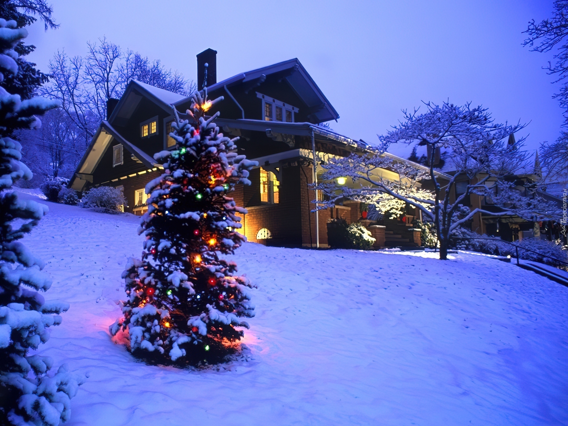 Edytor tapety: Zima, Boże Narodzenie, Dom, Oświetlona, Choinka