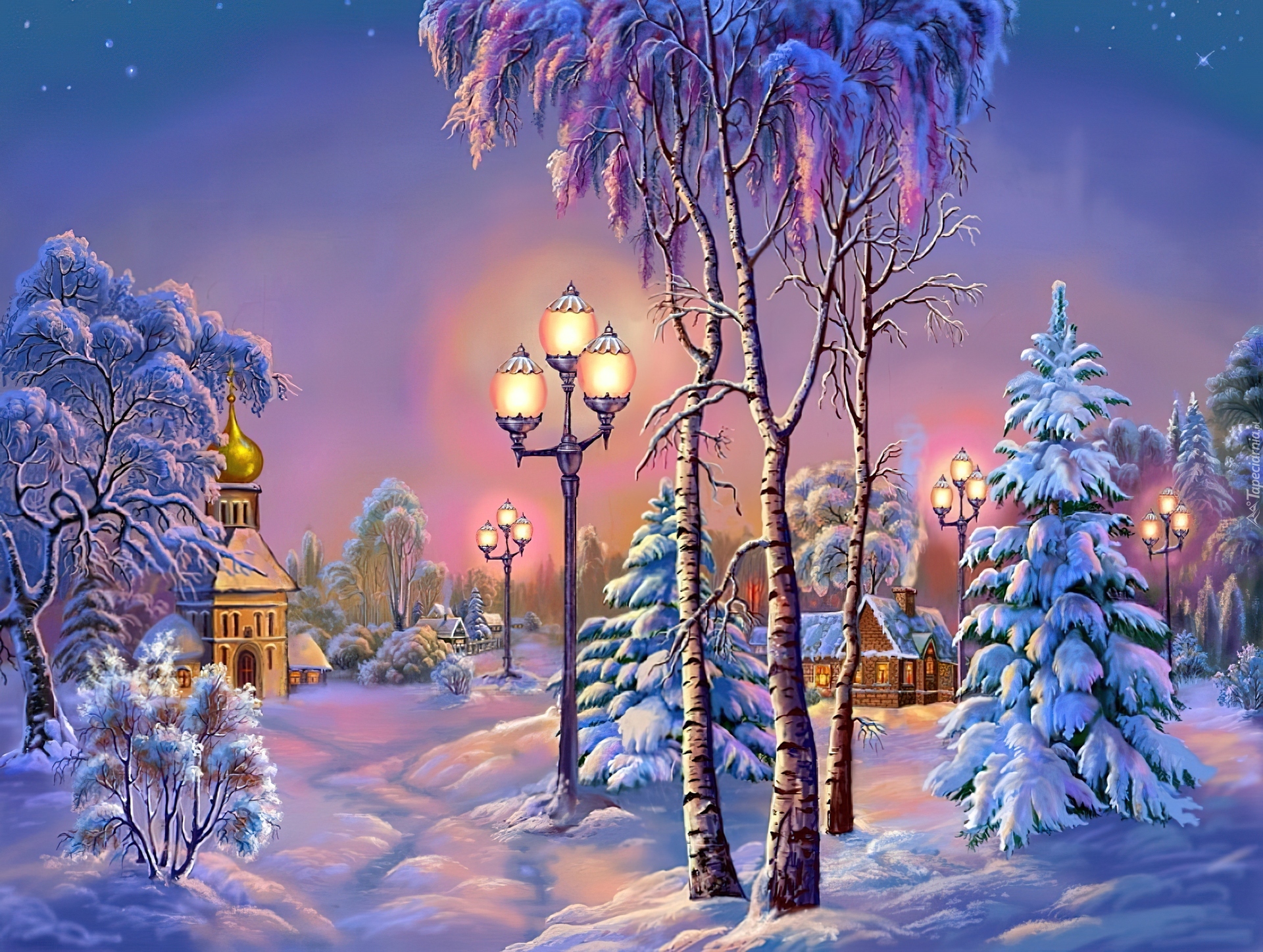 Edytor tapety: Zima, Latarnie, Kościół, Domy