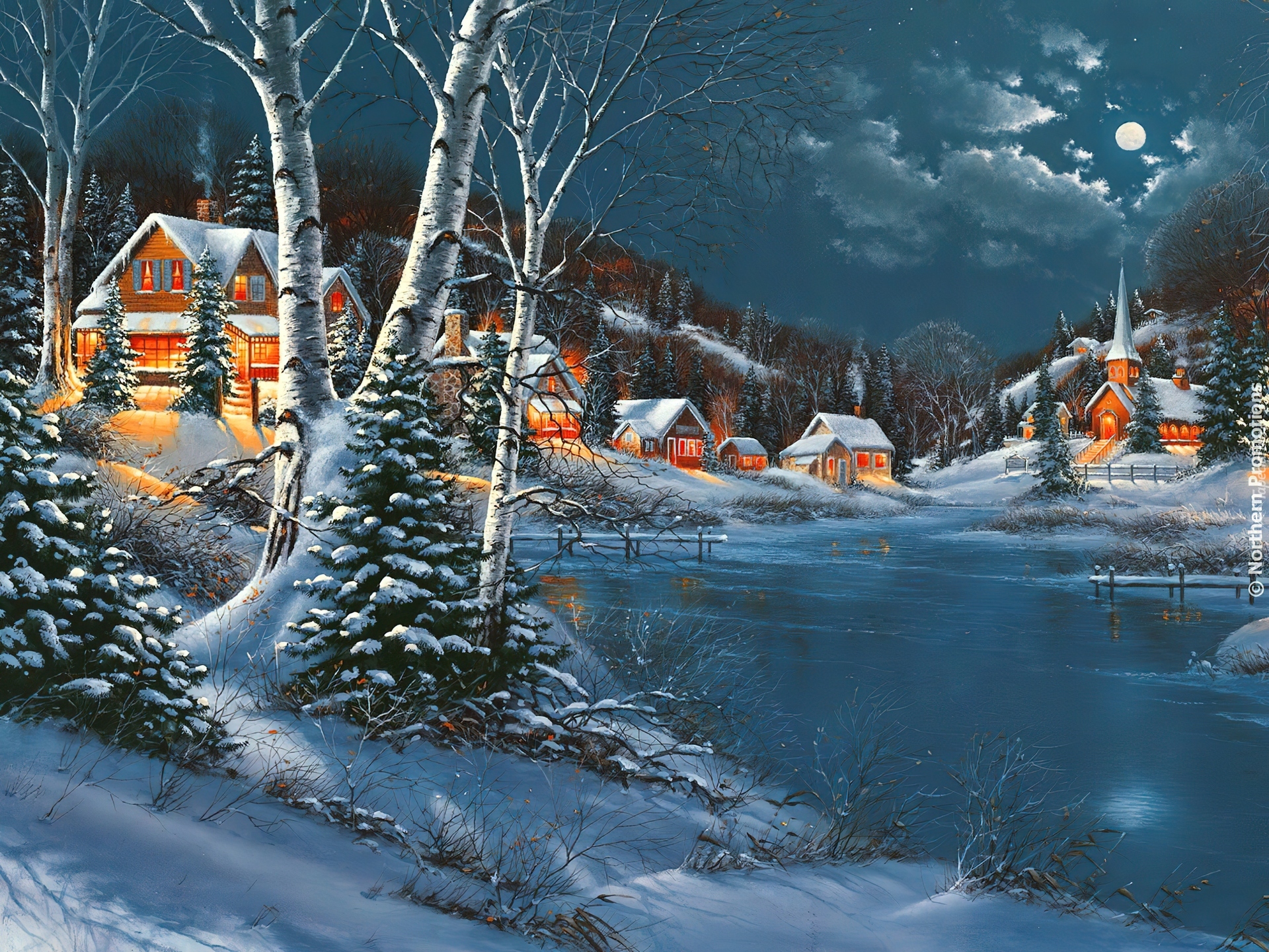 Edytor tapety: Oświetlone, Domy, Zima, Śnieg, Jezioro